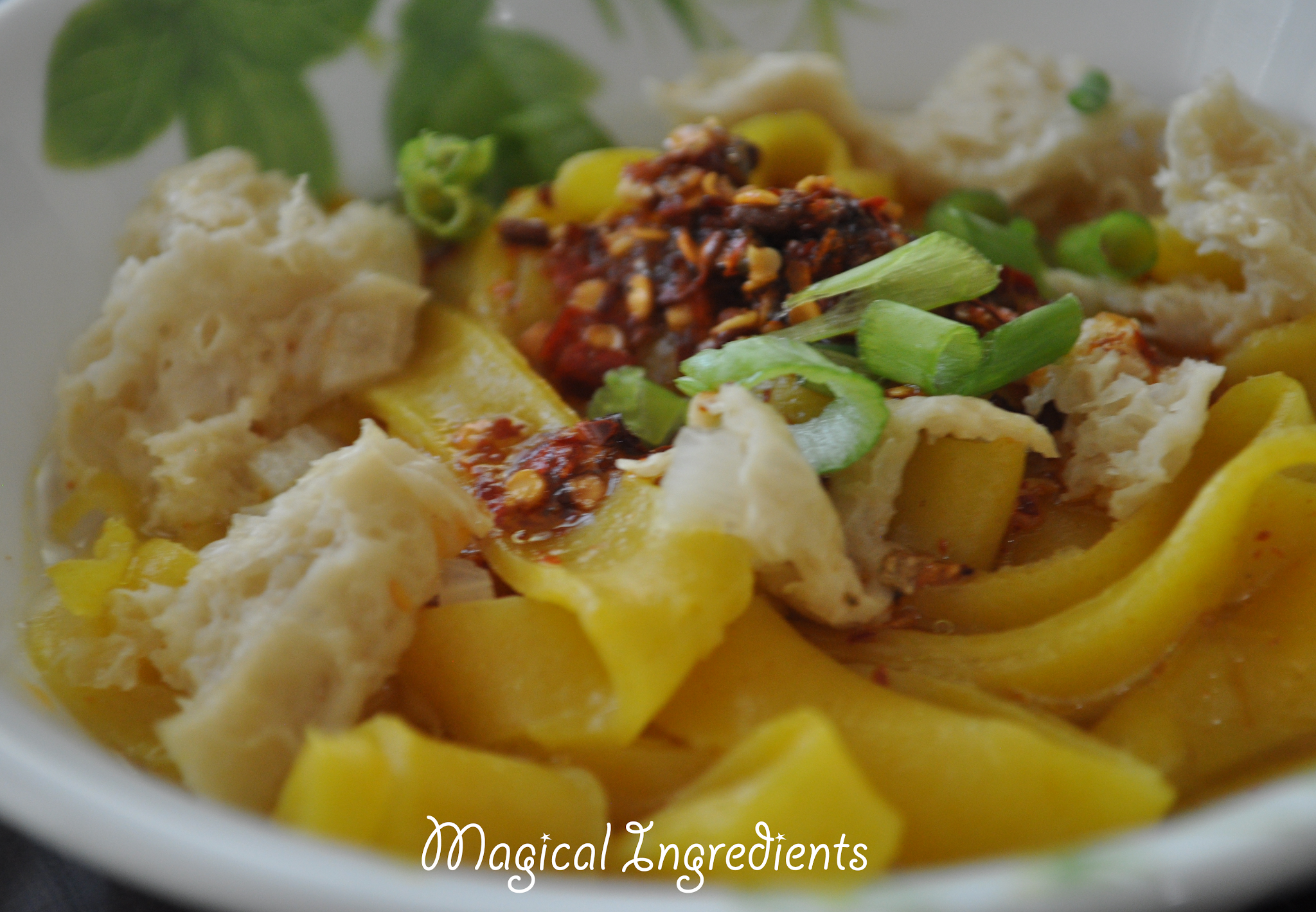 This reminds of the steamed rice crepe (ilai vadam) that we dry and deep fry. We devour the fresh steamed ones when we peel it off. This laphing is made with starch from all-purpose flour and we loved the texture and flavor of this noodle as well. This is a lovely and delicious noodle made with the starch and love how the gluten is used as a tasty filling. Remember this is a fiery noodle, so add the chili paste according to taste. Addition of garlic water, vinegar, and soy sauce helps in balancing the taste. The original recipe uses ajinomoto and since we have intolerant member, I have skipped using ajinomoto.