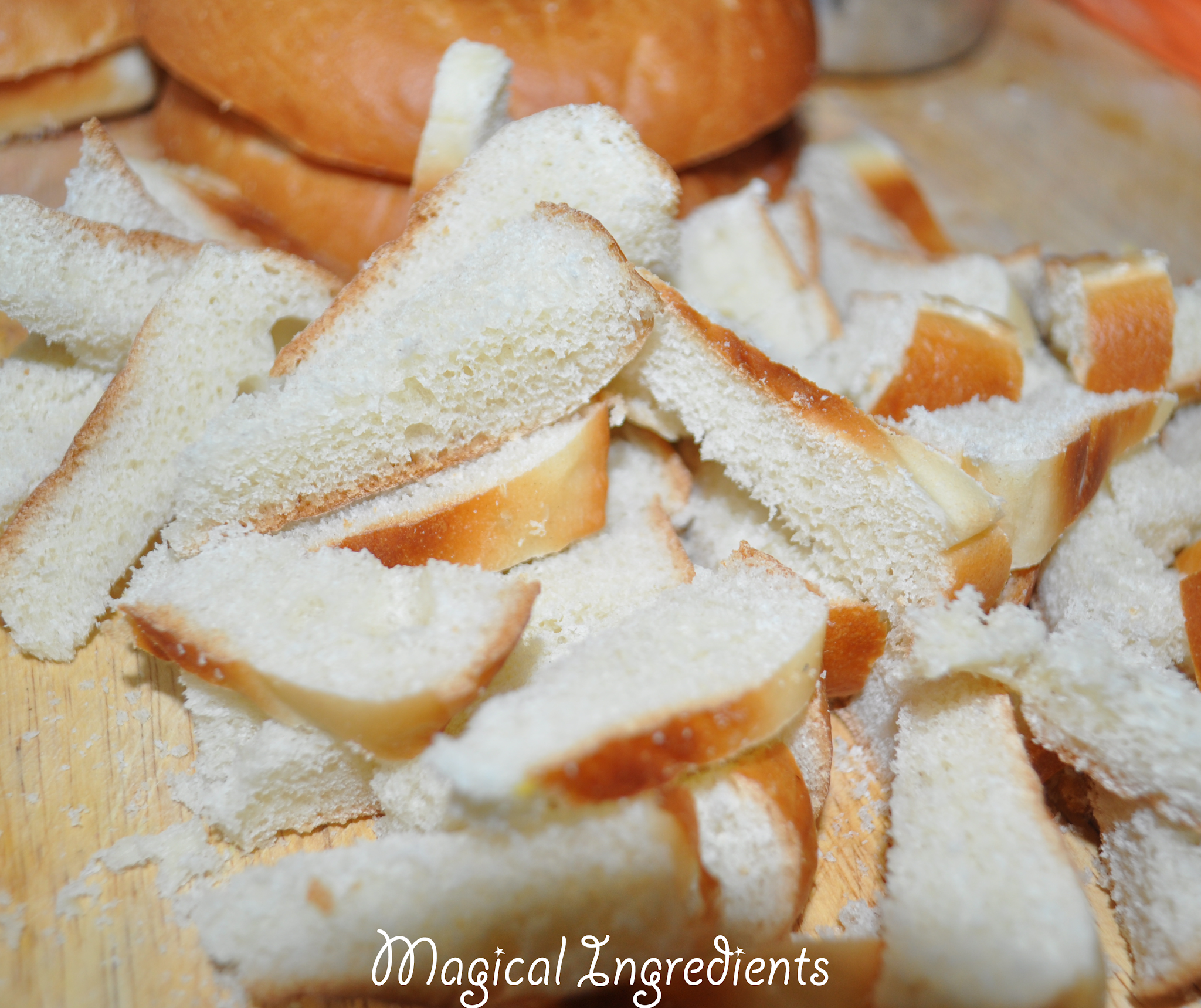 Slice and cut the bagels to thin 1-in chunks. Set aside.
