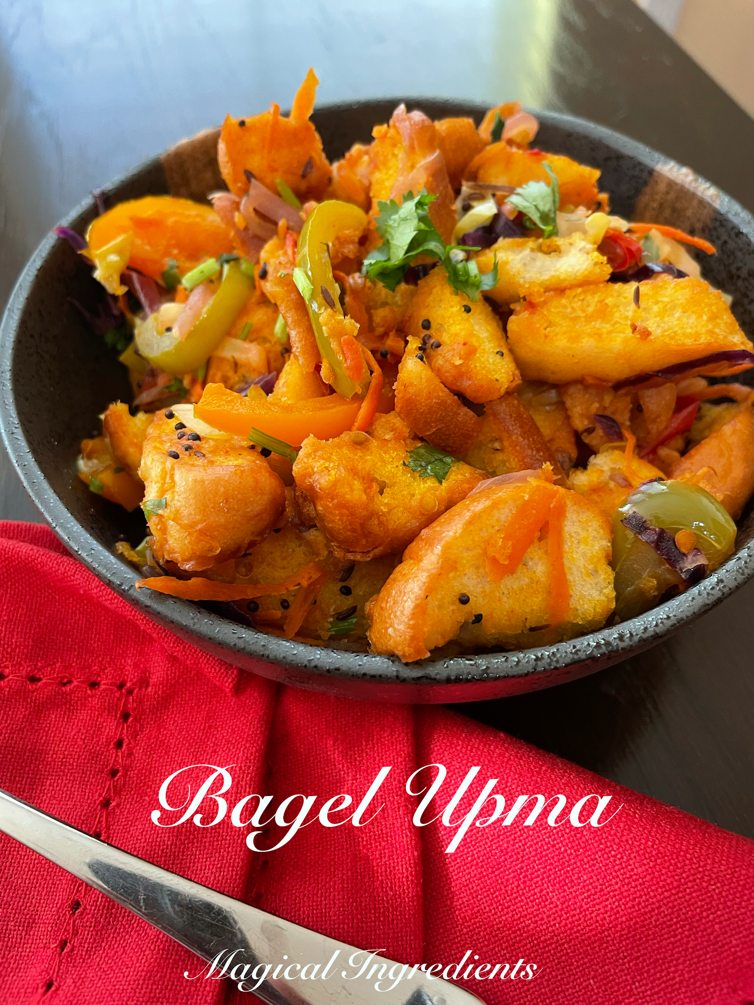 Bagel upma is very similar to bread upma, instead of using the regular bread, I am using bagel. Bread will lose the shape and may become a little mushy. But because of the texture of bagel, it holds the shape much better and no soggy food.