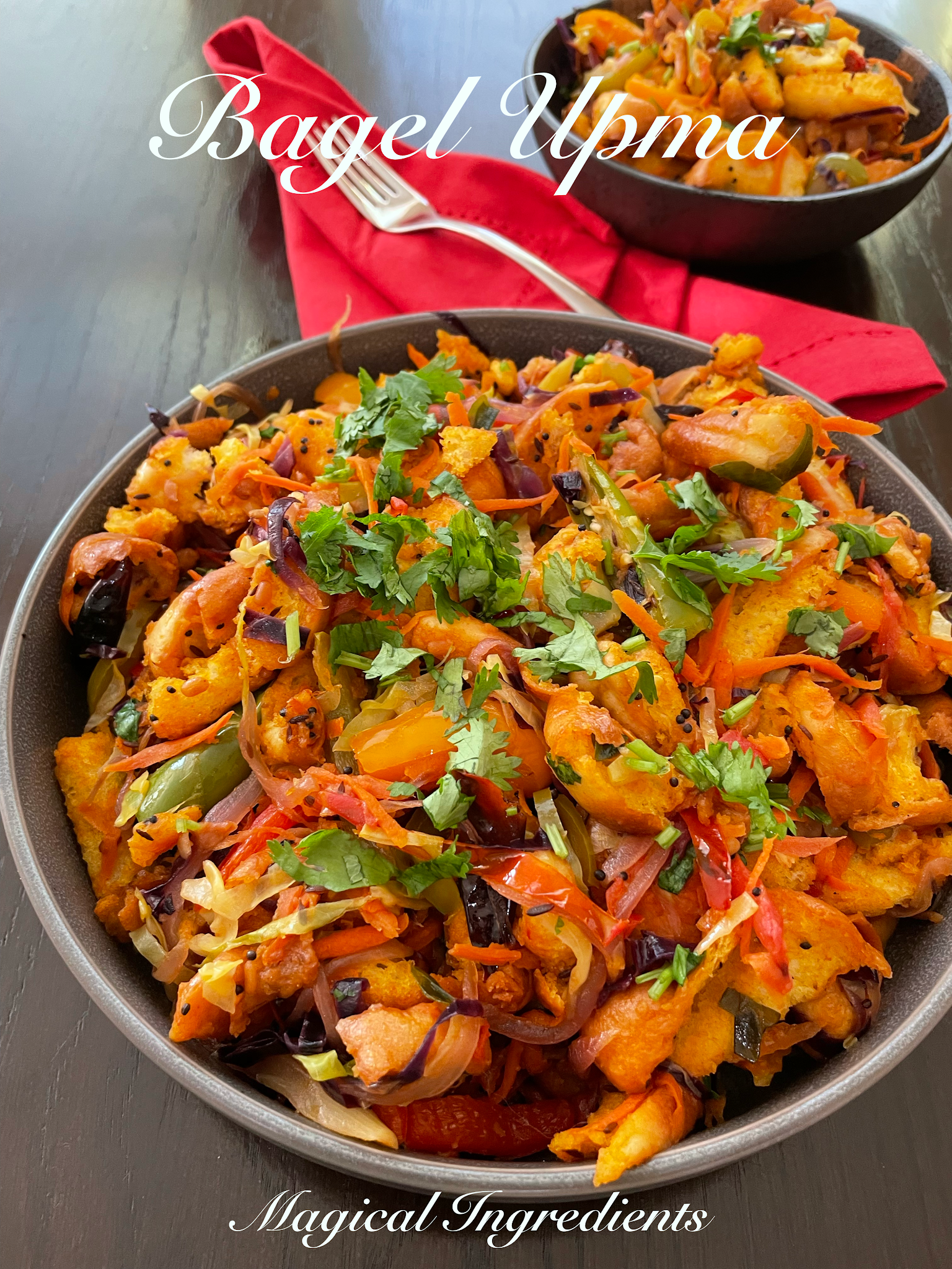 I love bread upma and both my parents used to make this for me. After trying bagel, I found the perfect one for making my favorite upma. I have added lots of veggies and always try to include colorful veggies. This can be made with whatever veggies on hand. Add cubes of tofu or paneer or some beans to increase the protein content. The end result is always a satisfying bowl of upma. This can be a breakfast, brunch, or even a quick fix for dinner. We love this for any meal. We love to eat bagels with spreads like Piquant Veggie Bagel Spread. But we love this upma too that we make sure we have a few bagels for making this whenever we buy bagels.