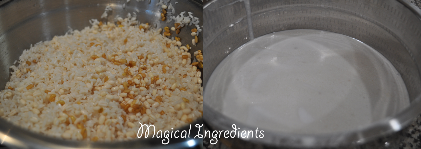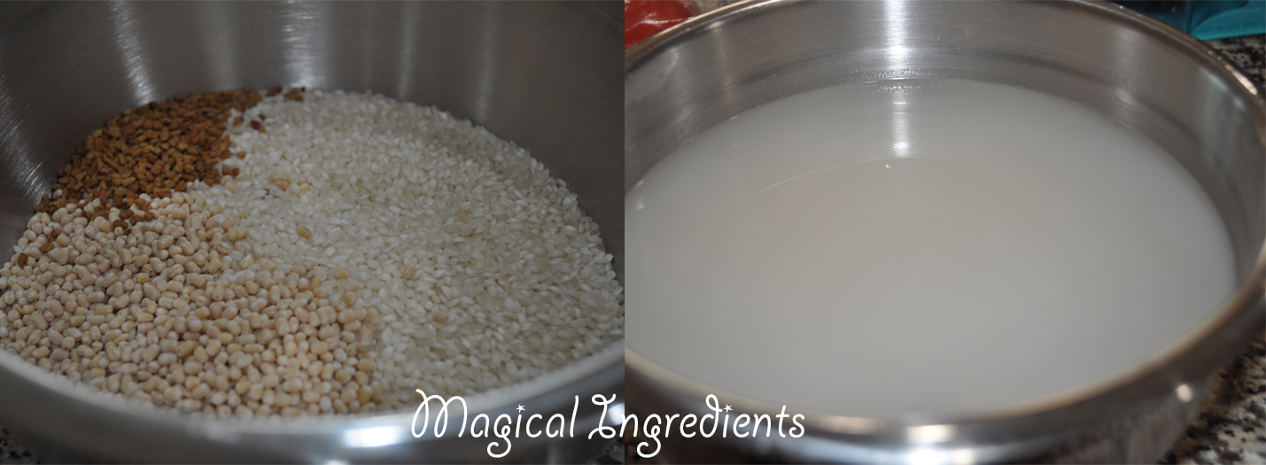 Soak all the ingredients in water. Add at least 1to 2 inch above the rice level. Soak for about 5 -6 hours.