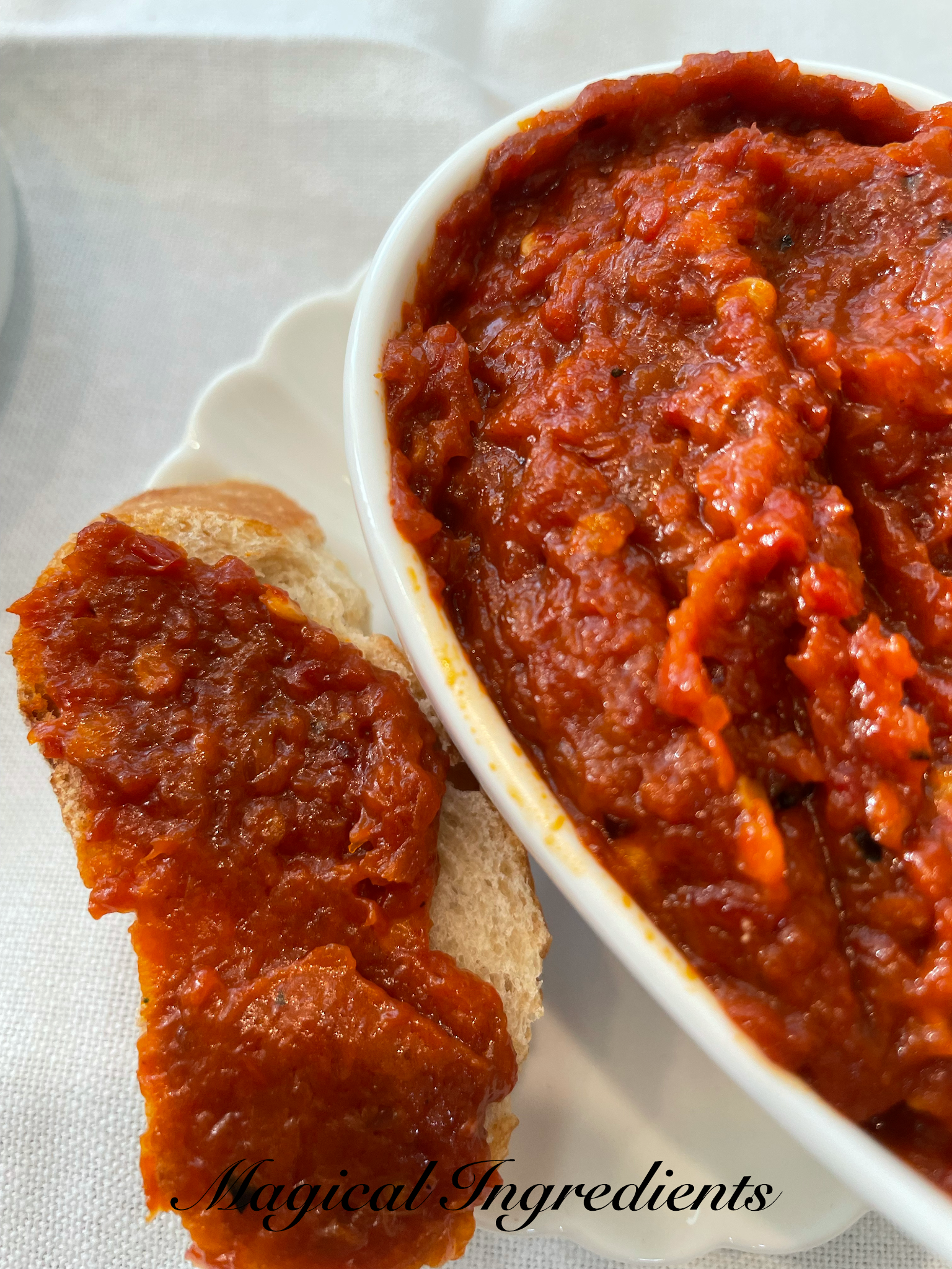 Lutenitsa is spicy roasted pepper relish from Bulgaria. The smoky flavors from the roasted red peppers, heat from hot peppers, balanced with tomatoes - this is the perfect dip/spread. This can be served as a dip with crackers or bread. Also can be used as a spread too. This is a simple relish which can be used in many ways. This is vegan too. In Romania, this is called Zacusca.