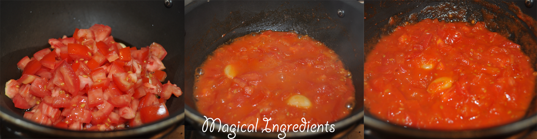 In the mean time, heat olive oil in a pan, add the whole garlic and chopped tomatoes and cook for about 15 minutes stirring now and then till most of the liquid evaporates.