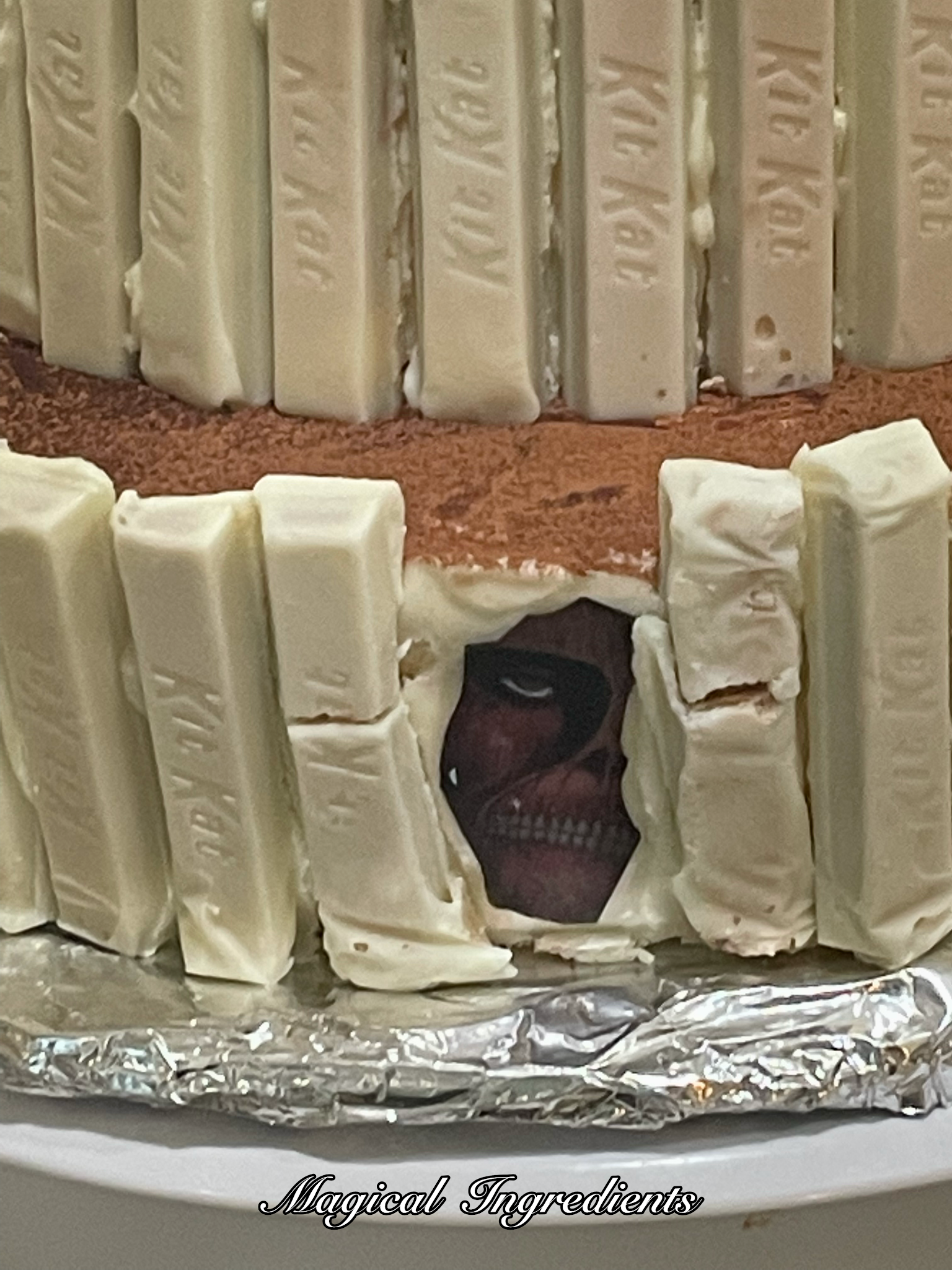 With the remaining half to three-quarters cup frosting, pipe decorations on the edge or use for attaching other decoration elements. The cake can be served at this stage. We had hole in the wall idea of the Attack on Titan cake, used white KitKat to make wall effect and in between a space made-out to serve the hole where the titan can be seen. On top we had Levi figure printed and laminated as the cake topper.
