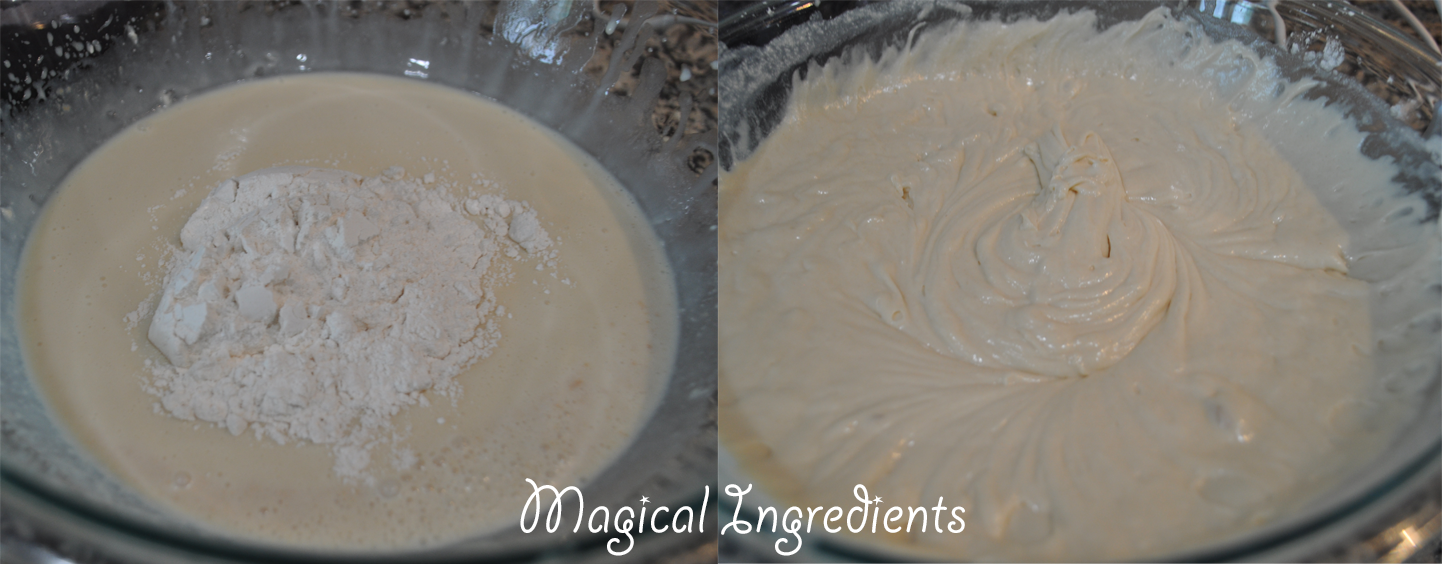 In another bowl, beat butter, condensed milk, and aquafaba till light and fluffy. Add the milk and vanilla, mix thoroughly.