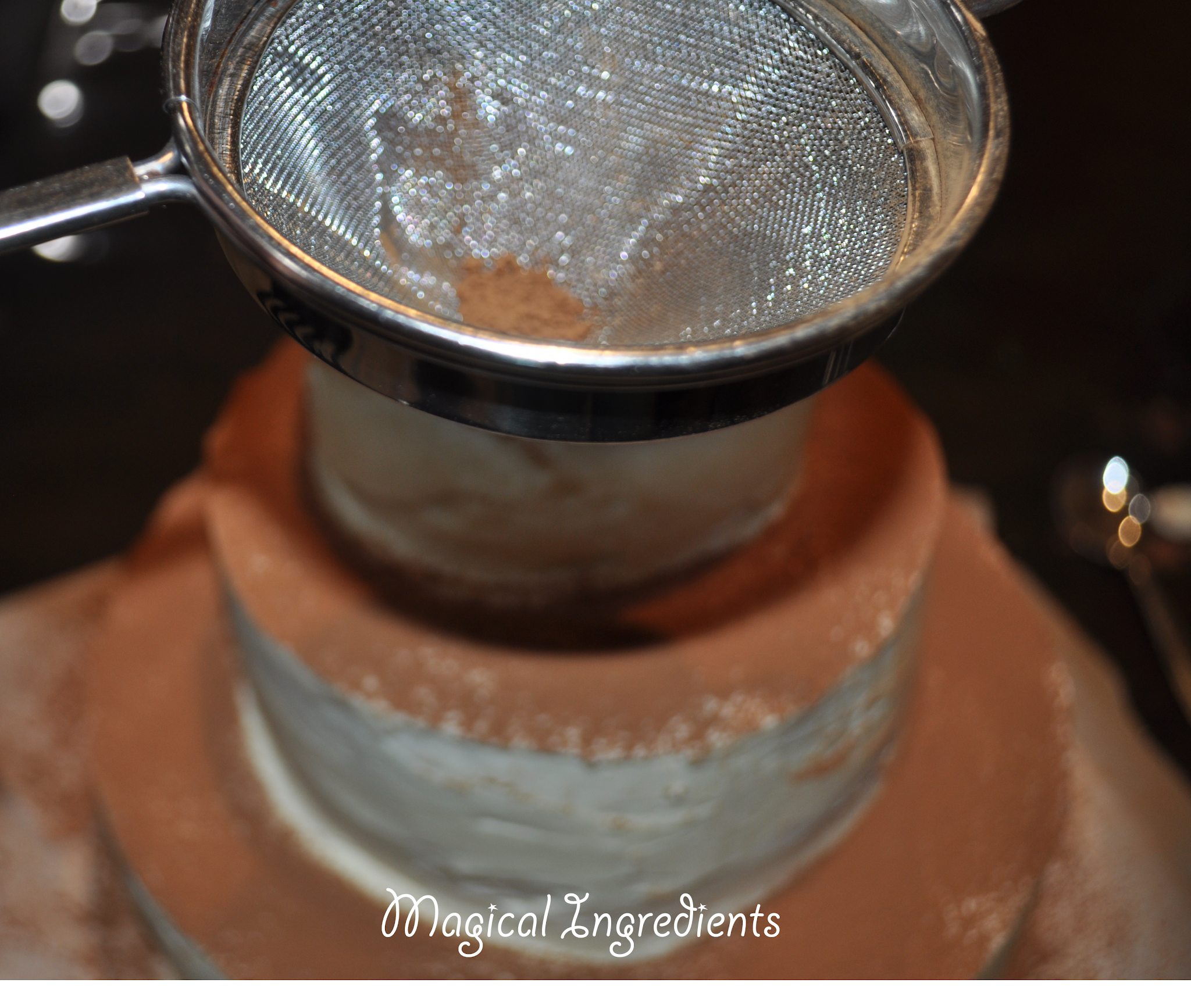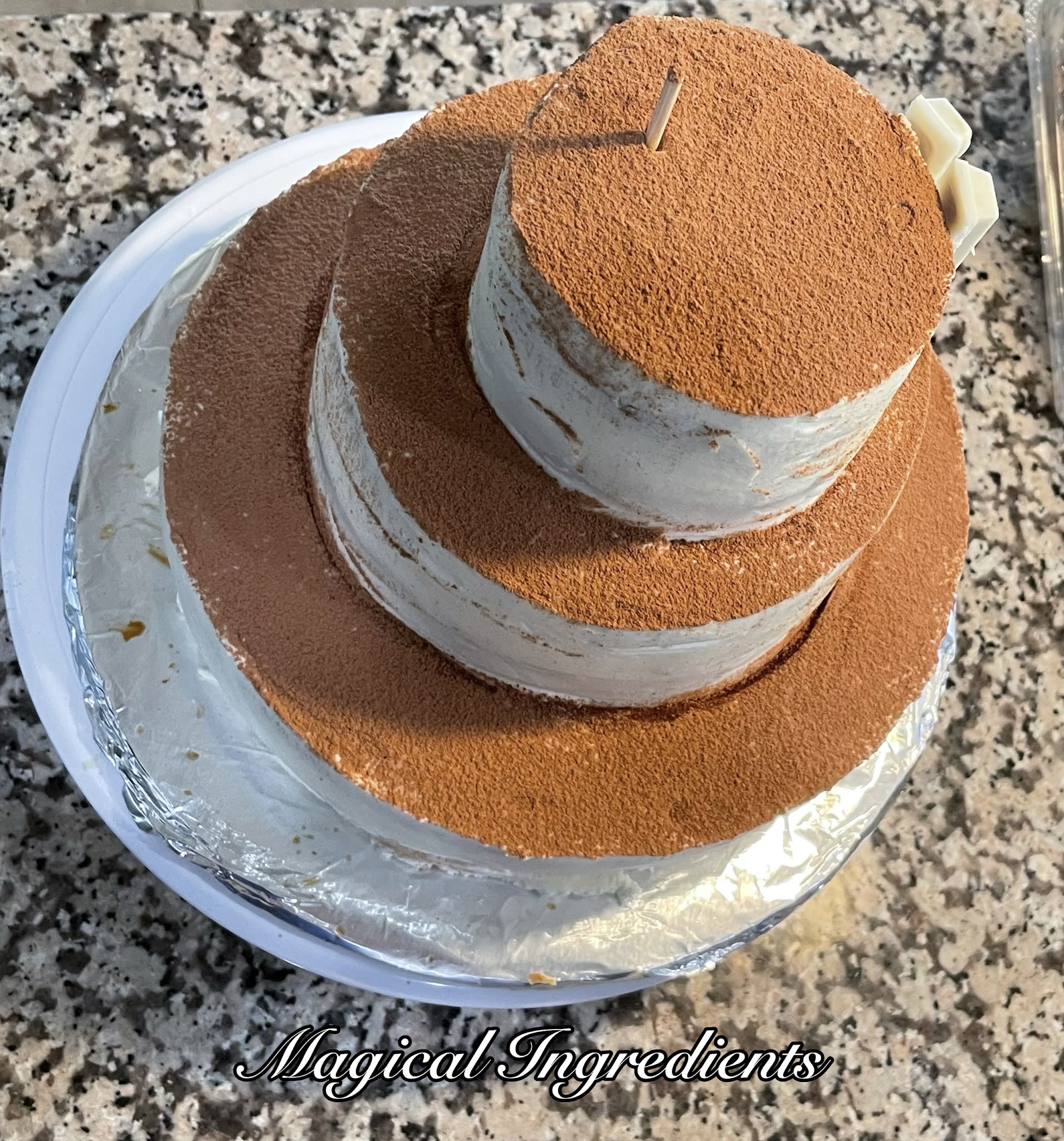 The measurements below makes a 3-tier cake - two 9-in cakes, two 6.5-in cakes, and two 4-in cakes. This is easy to make too. Bake the cake, make the cream, drench the top of the cake with coffee, fill inside the layers and frost each tier, secure the tier with skewers, and finish up the frosting, and sprinkle cocoa powder. You can completely frost or do a naked frosting. In both ways, it is addictive. The smallest 4-in layer bakes in 11-12 minutes, and the other two layers are done between 14-16 minutes. Checking for a clean inserted toothpick is beast depending on your oven. Here is a quick tip for frosting the cake. Insert pieces of parchment under the base layer for clean finish. When the decoration is complete, these parchment papers can be pulled out leaving a neat cake.