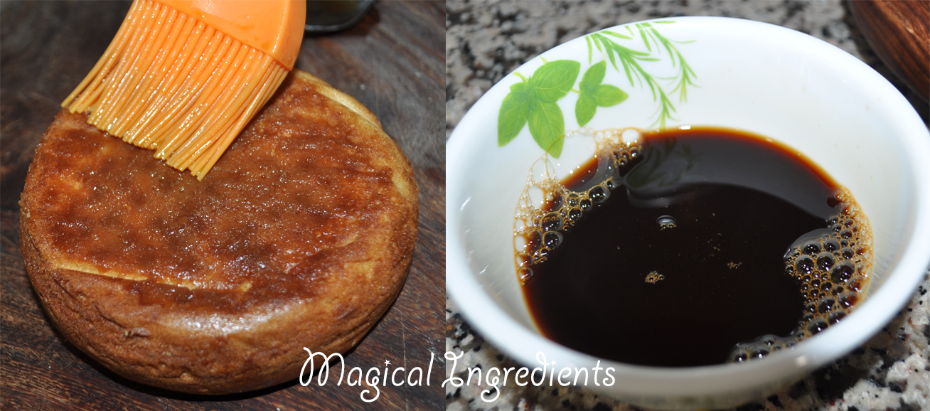 Add coffee to hot water and mix. Two teaspoons of sugar can also be added if you prefer. Mix thoroughly and cool. Trim off the cake to even top. With a brush, drench on one side of the cake completely.