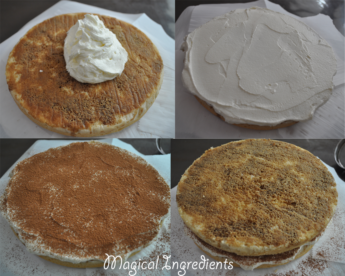For the decoration: On a turntable, keep a cake board. Place one 9-in cake and insert pieces of parchment paper. Add cream to the coffee drenched side and spread evenly to desired thickness. Sprinkle cocoa powder generously. Add the second 9-in cake.