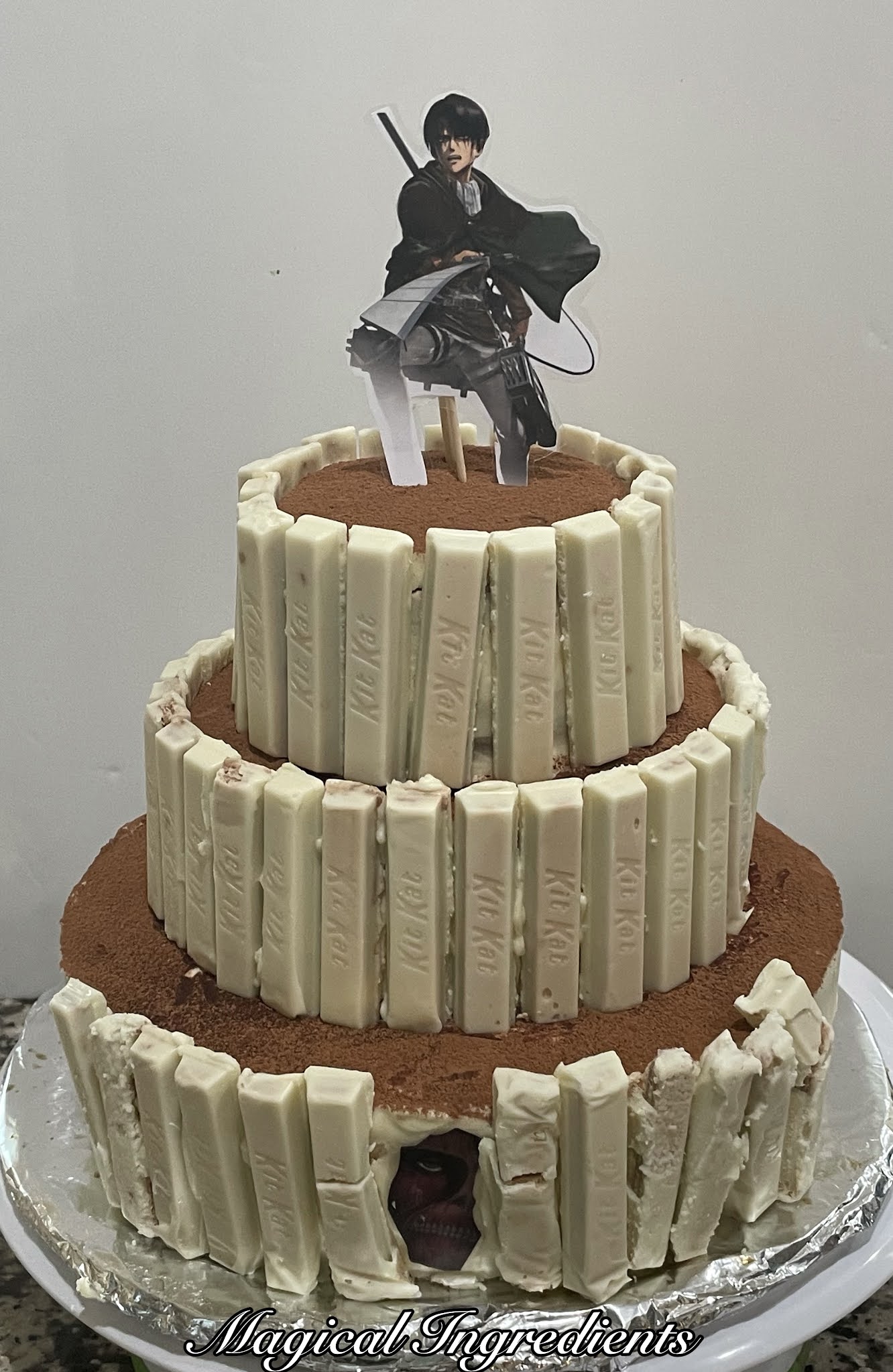 I have made this cake for my son's birthday party. Tiramisu is his favorite. So made his favorite dessert based cake. Since we had many people we made a three layered cake, this can be made in single layer too. We had an anime "Attack on Titans" themed party. We used White chocolate KitKats for building the three walls on the three tiers. We had a small space without wall on the bottom cake layer where the Titan can be seen. We printed image of Titan and Levi, and laminated it. We inserted the Titan on the base layer and attached the KitKats on both the sides. The laminated Levi was taped to a toothpick and inserted on top as a cake topper. This is one of a kind DIY anime theme cake.
