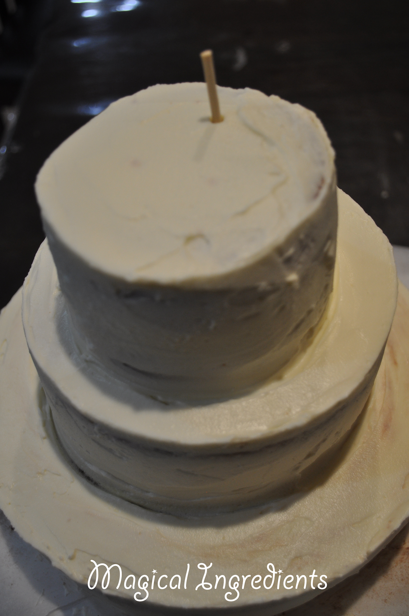 Add the 4-in cake and repeat the same frosting steps. Insert three measured skewers on to the cake such that it reaches from top to bottom holding the cakes together.