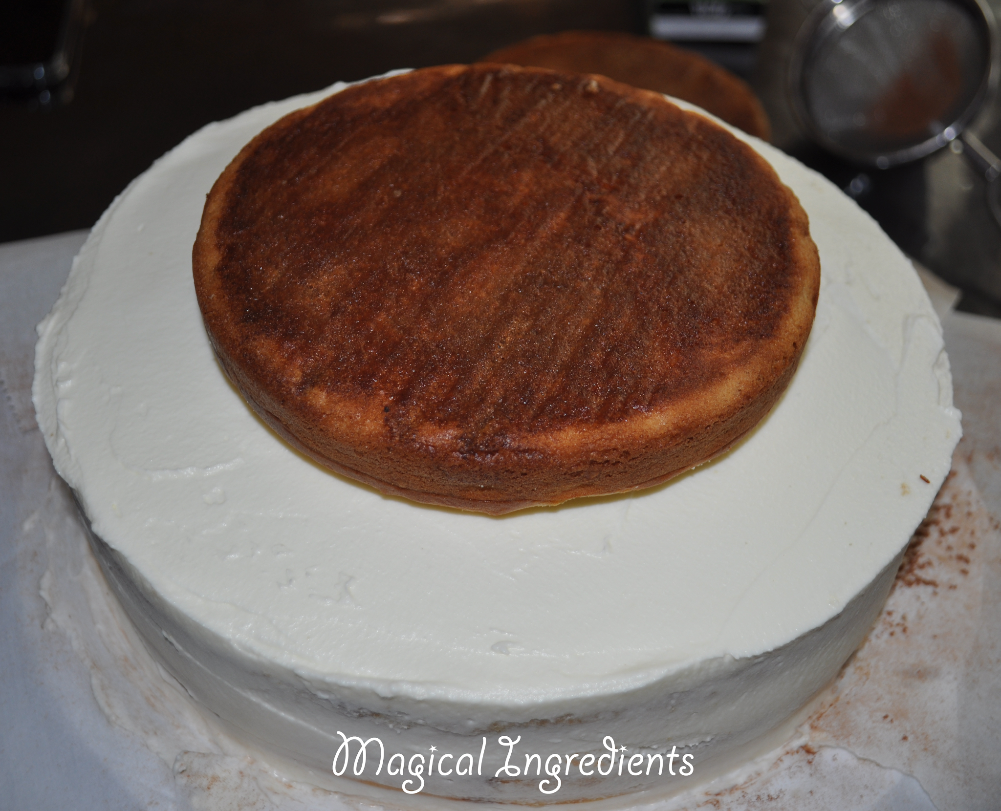 Cool the cakes completely. In the meantime, whip the mascarpone cheese, cream, and powdered sugar to stiff peaks.
