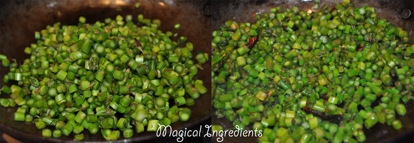 Add the asparagus. Sprinkle a little water, cover and cook for 2-4 minutes on a medium flame or till the asparagus is tender but firm.