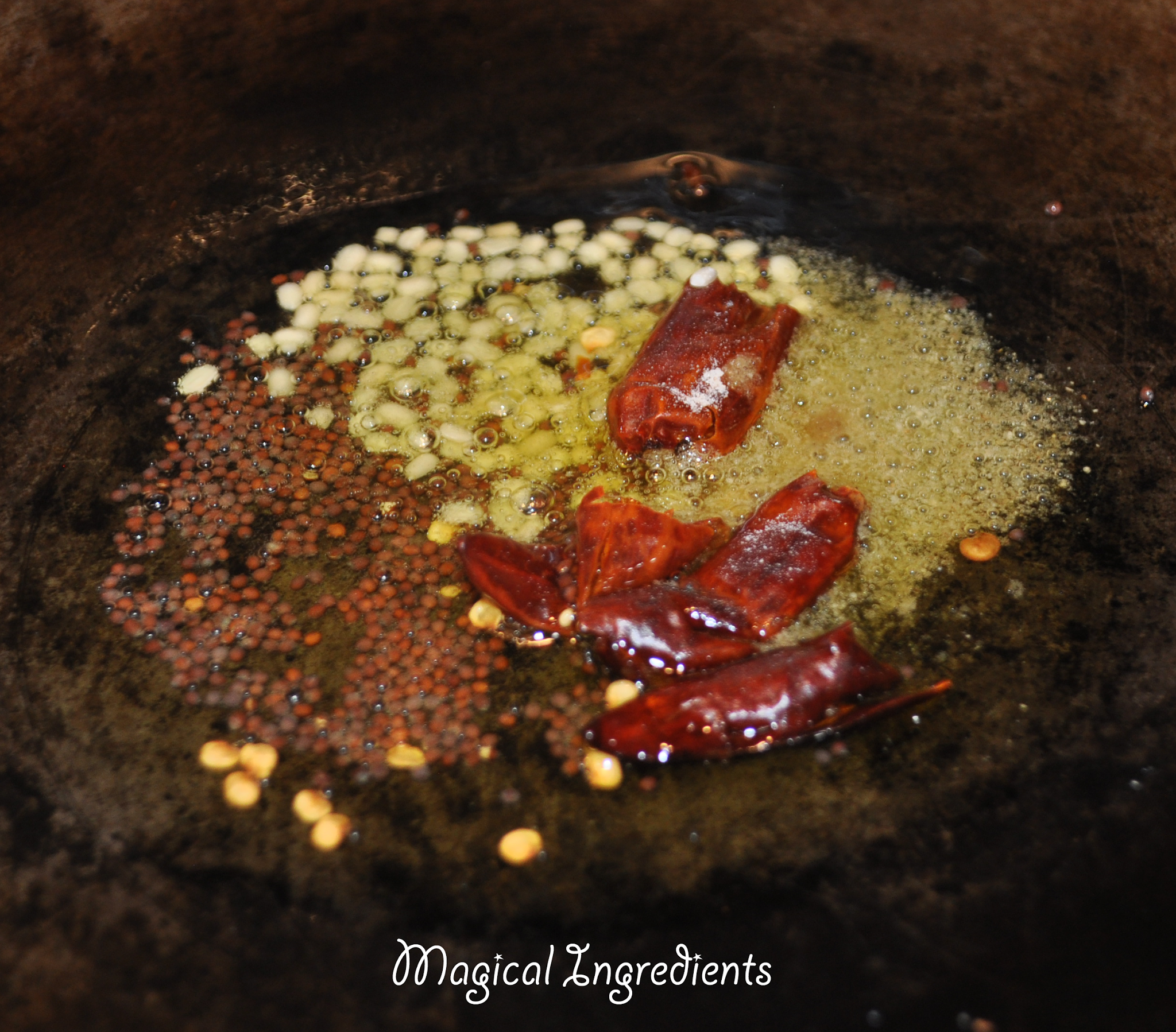 Heat oil in a cast-iron pan. Add the oil. When it is hot, add the torn red chilies and mustard seeds. When the mustard splutters add the split urad dhal followed by asafetida and curry leaf. Fry for 30 seconds till the dhal is golden brown.