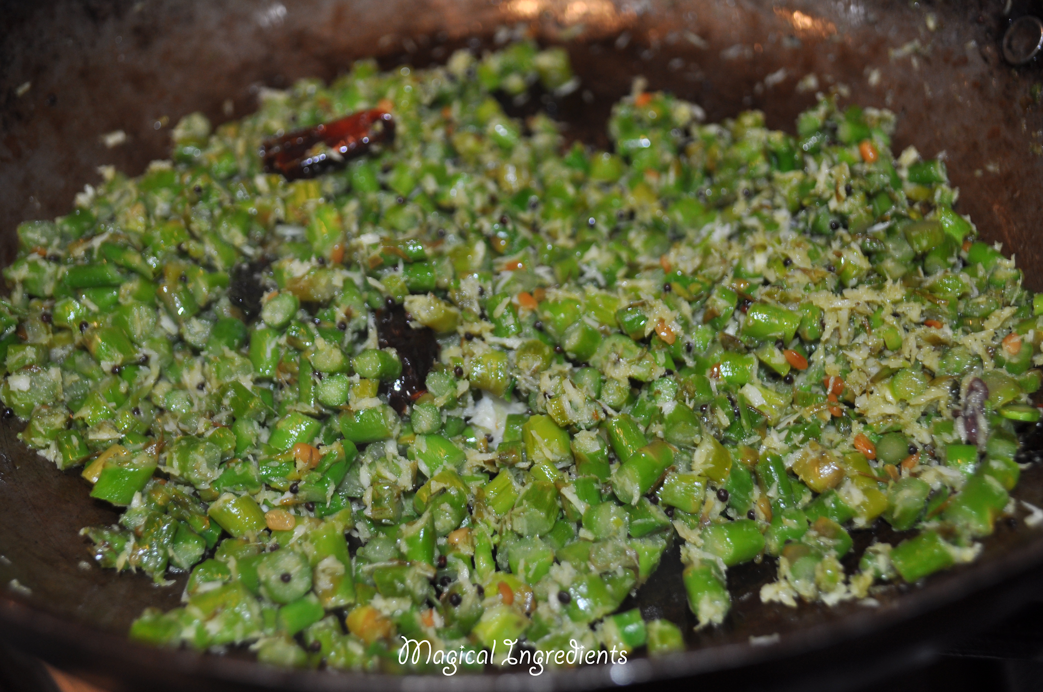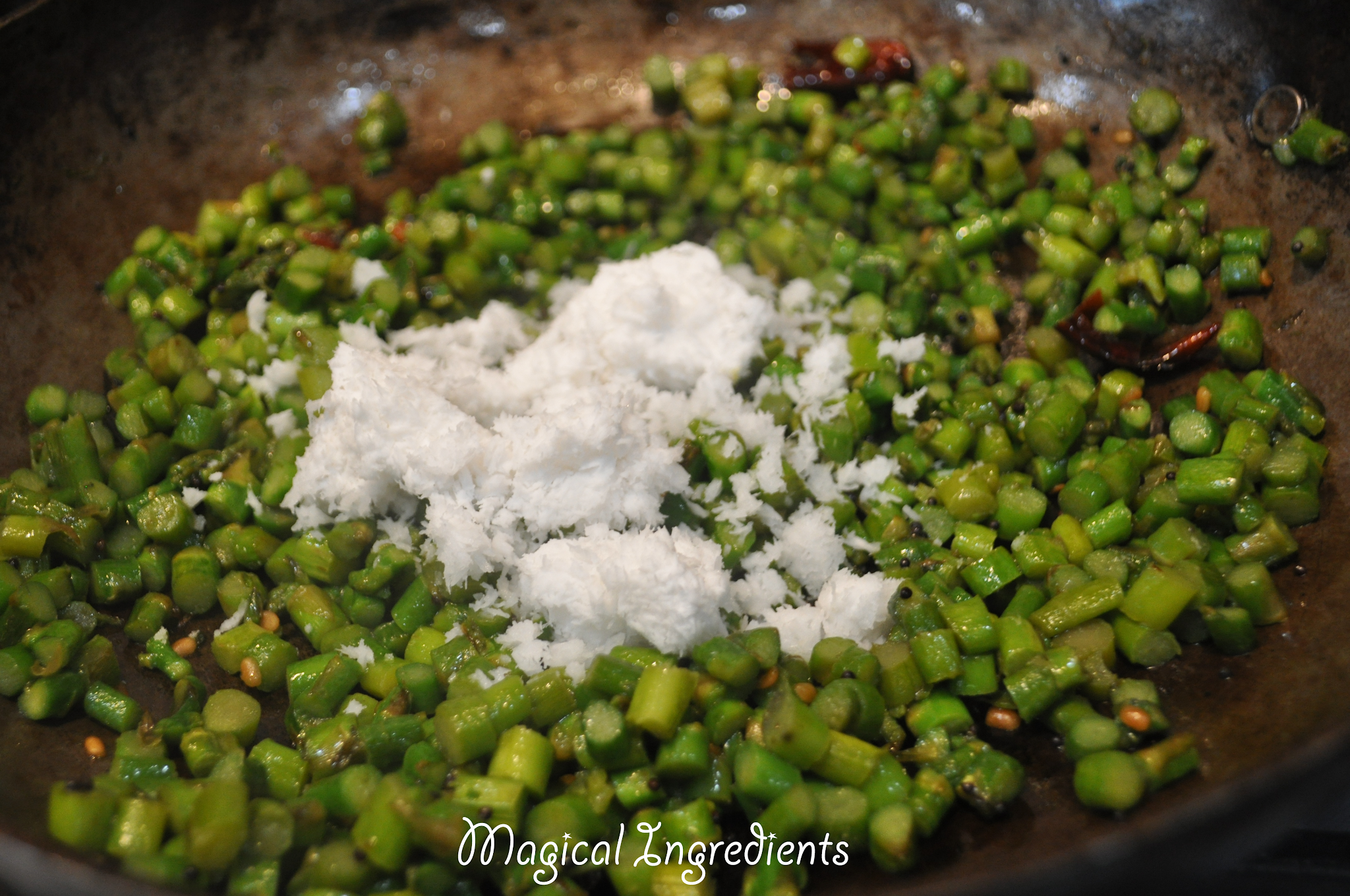 Sauté for two minutes till the coconut is evenly spread and toasted. Transfer to a serving bowl.