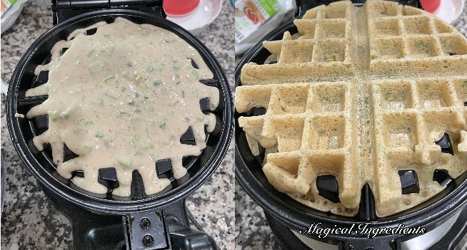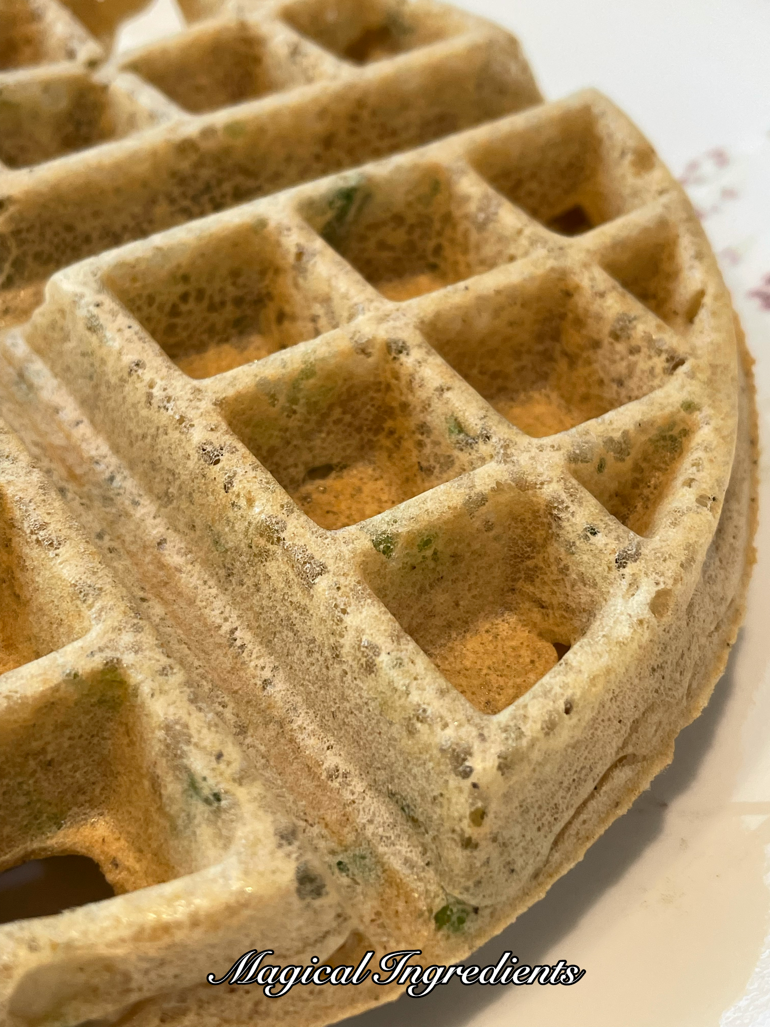 My recipe is inspired by Afghani aushak and mantu. Aushak is steamed gandana filled dumplings served with garlicky yogurt and meat sauce. Mantu is meat dumplings served with yogurt sauce. Since we like the chive flavored gandana, we often include that in our parathas and dosa. I made pancakes and waffles with them and they were delicious. Instead of using all-purpose flour and making dumplings, I started to use them in whole wheat based meal options.  Instead of stuffing making the laborious dumplings, just add them in the batter and make these easy and quick waffles/pancakes. For a crisp one make it in setting 4 or 5 in your waffle. They taste amazing and satisfying. Serve them with yellow split lentil stew (vegetarian option instead of meat) and yogurt to make a perfect meal. Plus this is made with whole wheat and hence more nutritious. This a vegan waffle and serve with lentil stew and skip yogurt or use plant based yogurt for a vegan meal. They are great with coconut chutney too!