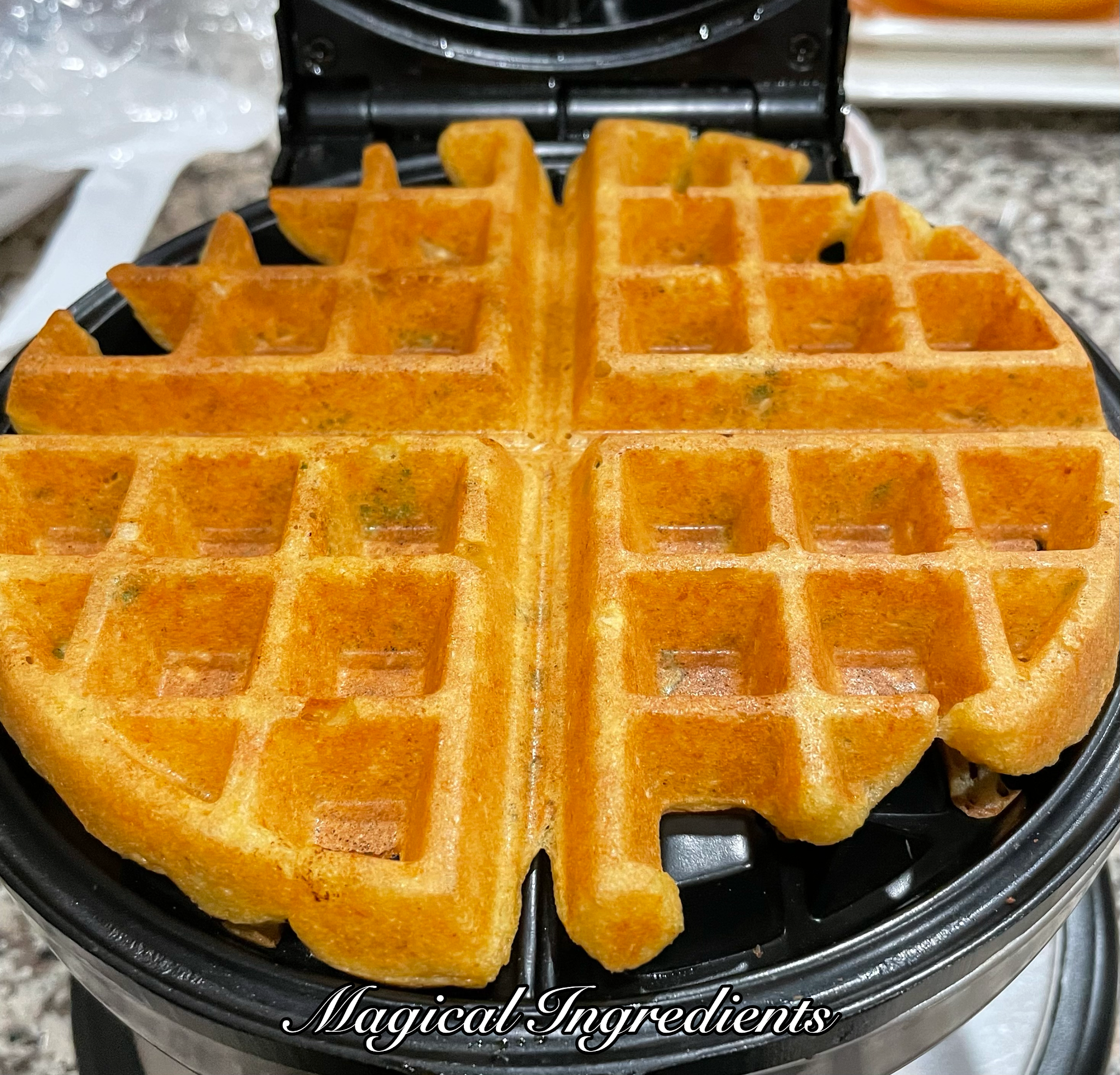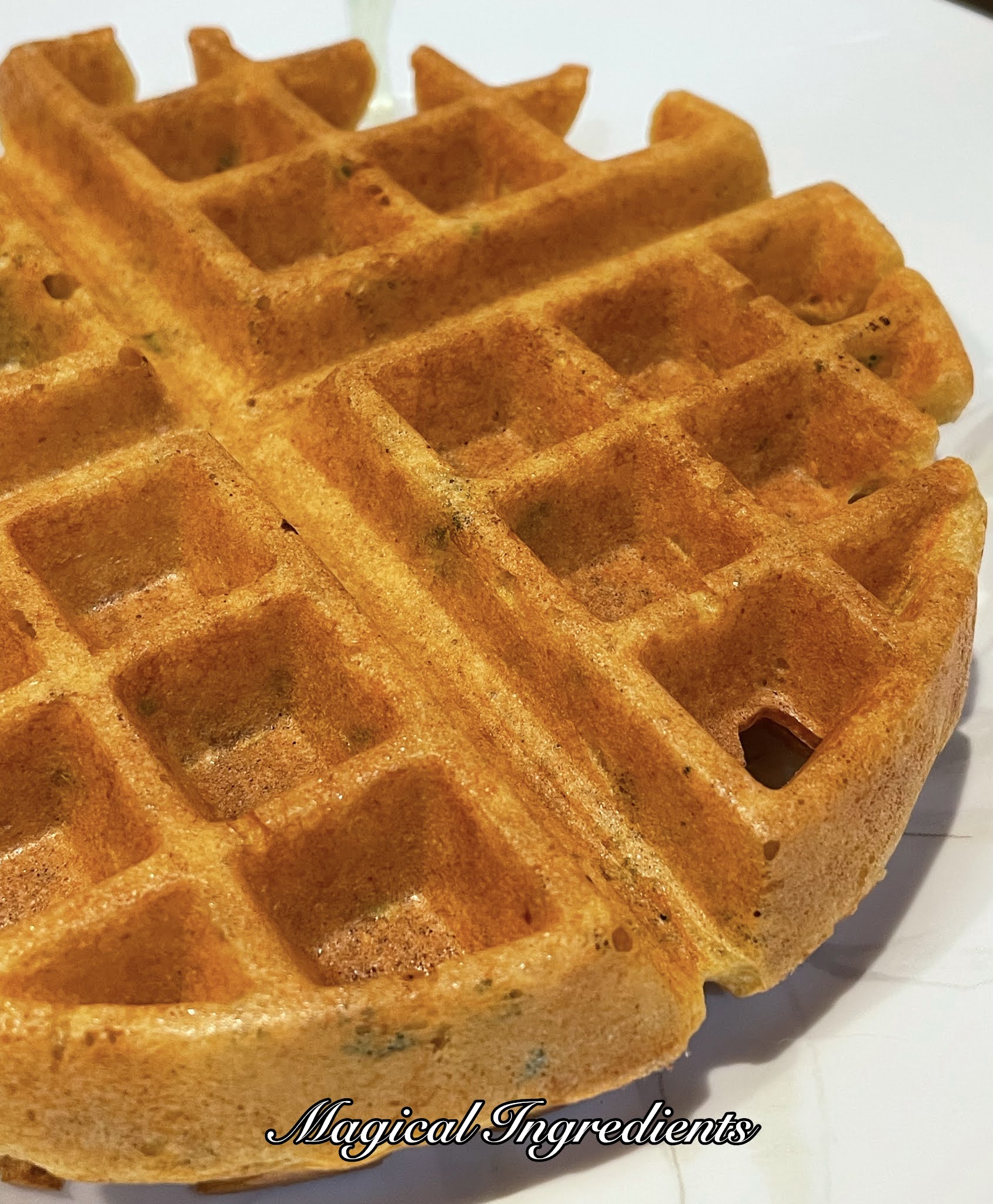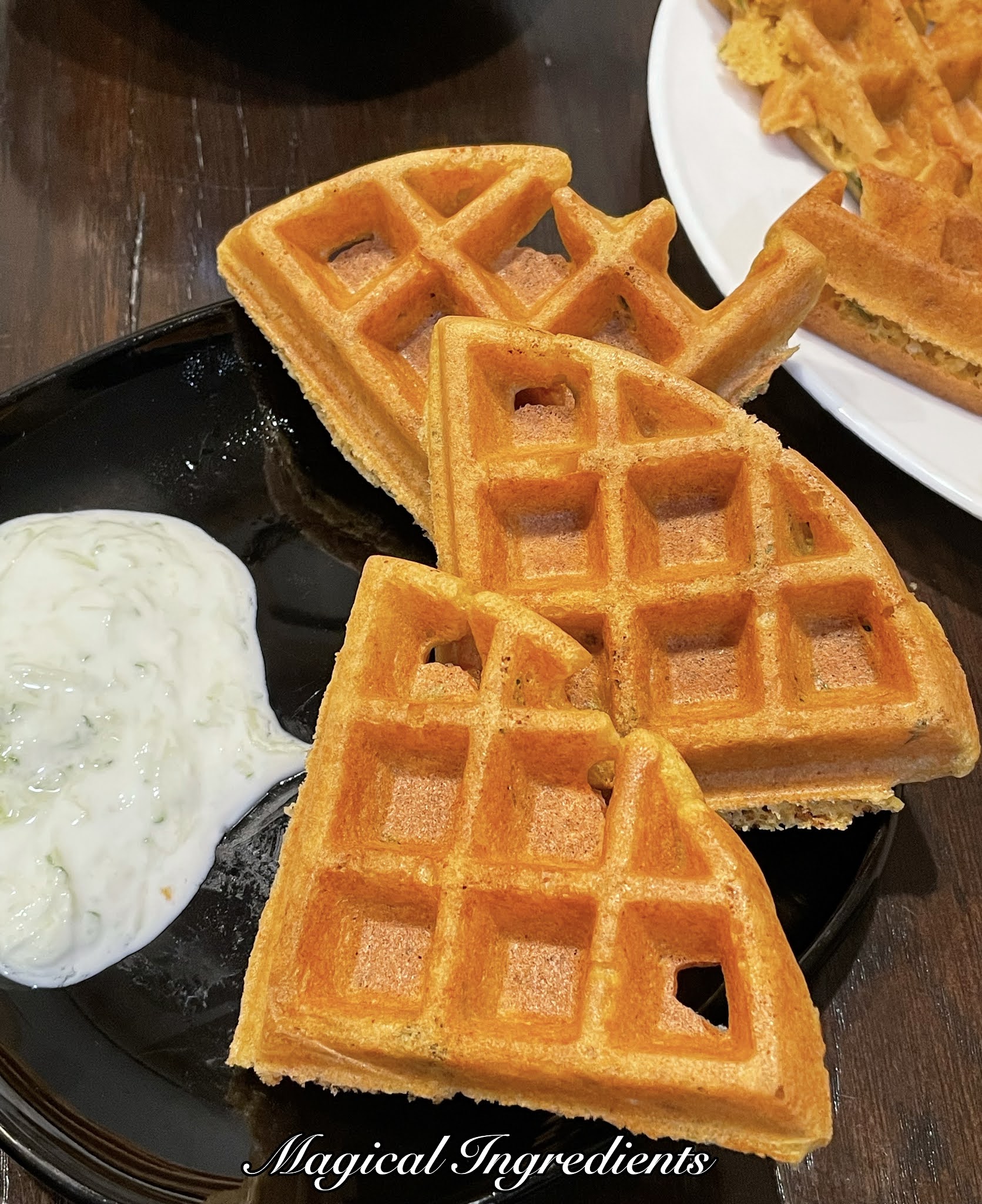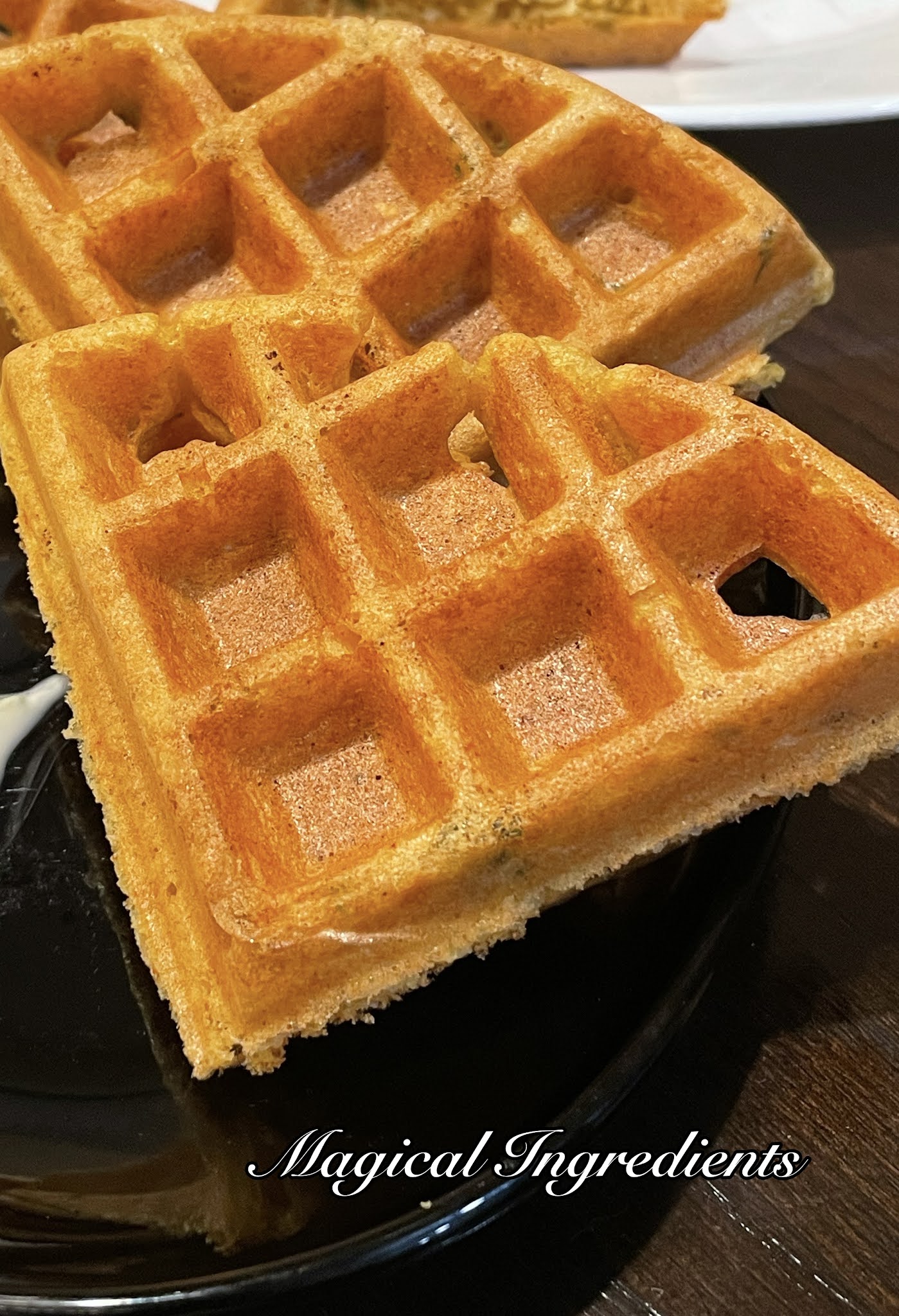 This waffle is easy to make. Just mix everything and pour on your waffle maker and cook them according to the crispness you prefer. I usually keep it in setting three. Perfect crisp on the outside, soft inside. To make it vegan, replace the Greek yogurt with plant based yogurt or unsweetened milk. Any herbs of choice can be used.
