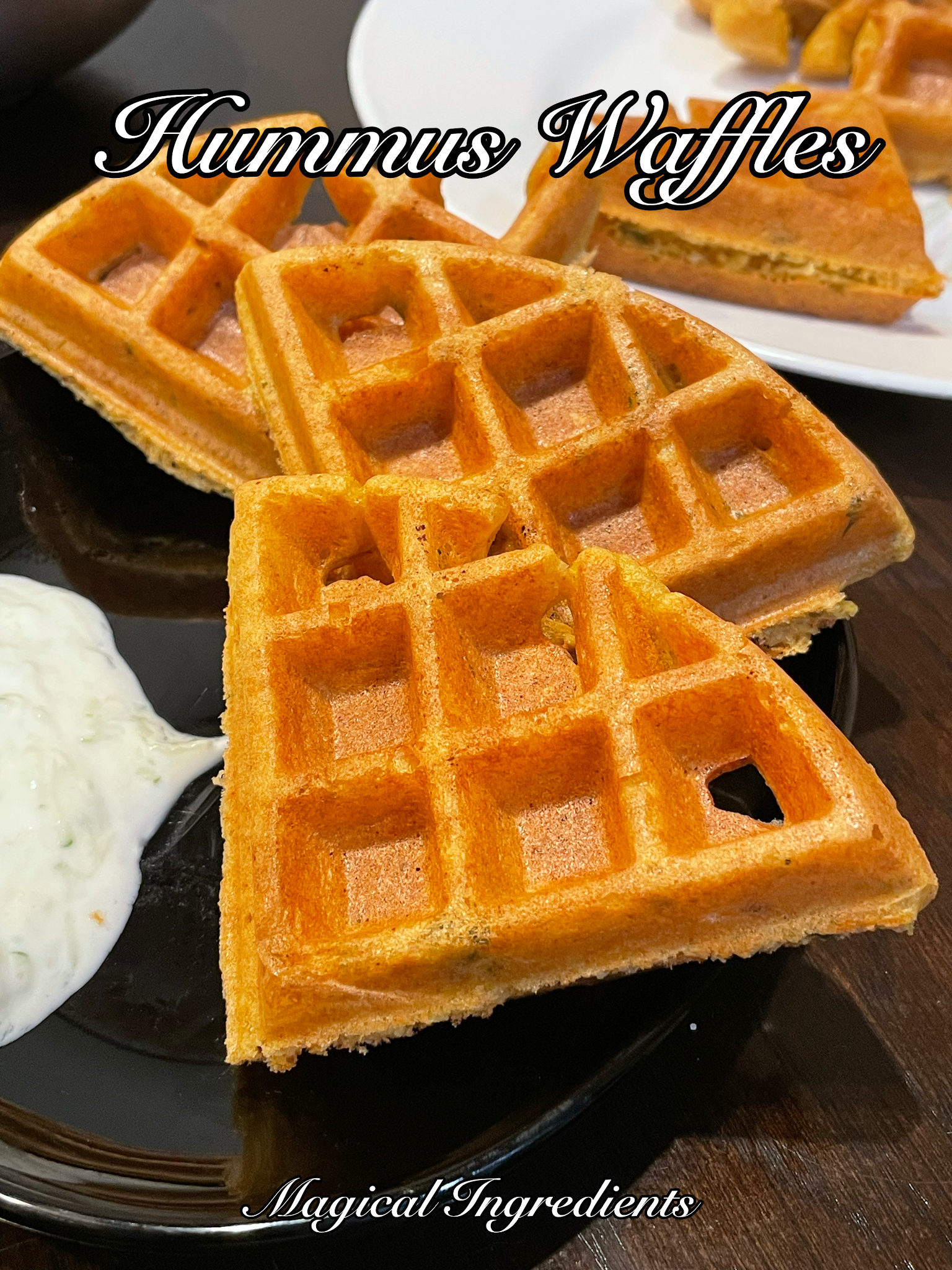 This is a simple, easy, quick, and nutritious waffle. Hummus, Greek yogurt along with whole wheat flour make a healthy option. This can be whipped up in a few minutes with any flavor of hummus you have on hand. This is perfect for a healthy and satisfying weeknight dinner or for breakfast or relaxed brunch. Serve this with tzatziki or whipped feta dip. To make a scrumptious meal serve with a salad. Greek salad pairs perfectly with this. This is an eggless recipe. Hummus and aquafaba perfectly balance the texture of the waffle/pancake.