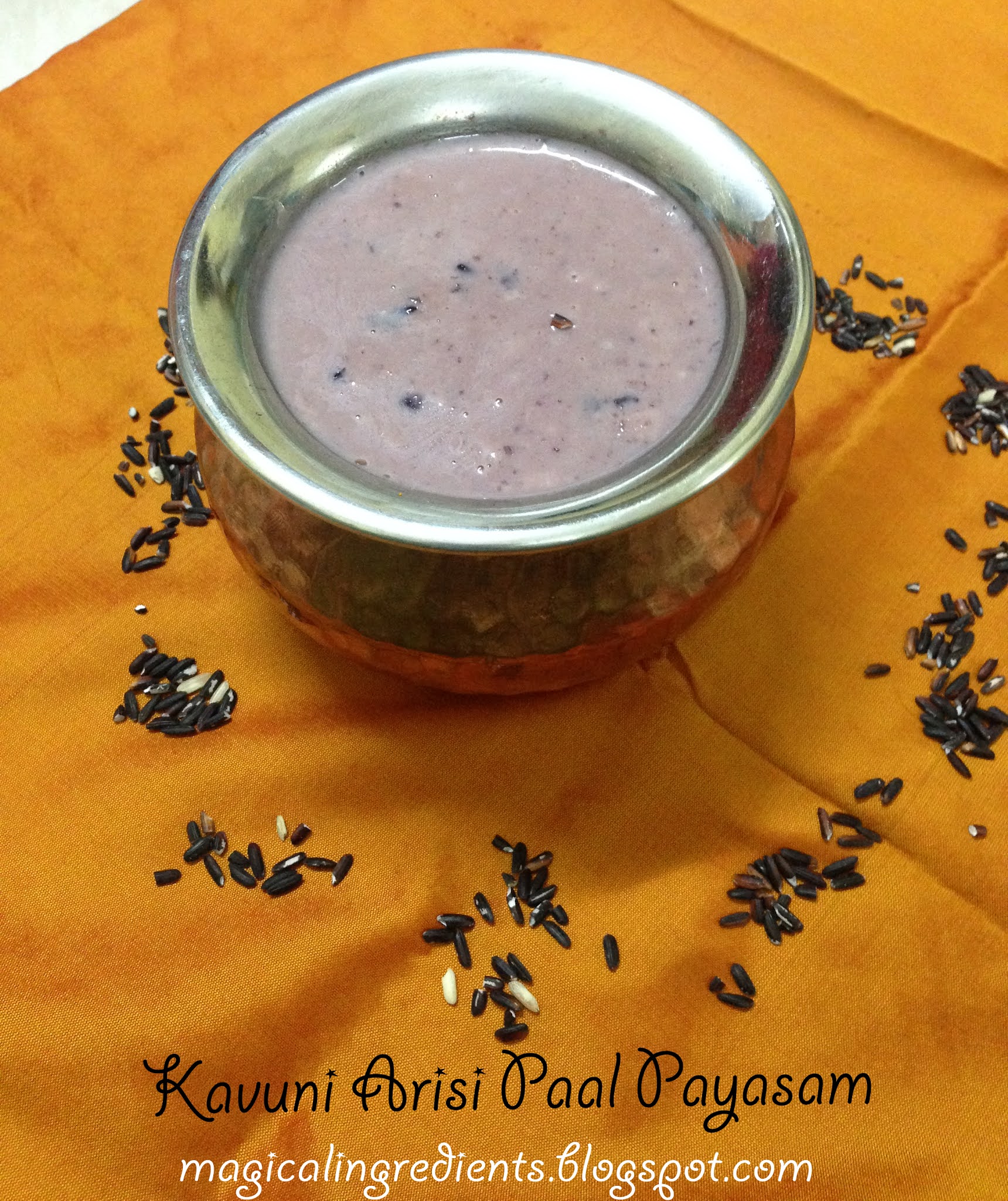 I wanted to make the traditional dessert but my daughter insisted in making the paal payasam (pudding). This kavuni arisi/black rice is rich in antioxidants, iron and fiber. The pudding is easy to make - just one small thing - you need to soak the rice for at least 5 to 6 hrs. The rice imparts a tinge of purple color to the pudding though it is called black rice. We gobbled it up as soon as I made it.  Creamy pudding with chewy rice here and there - awesome!
