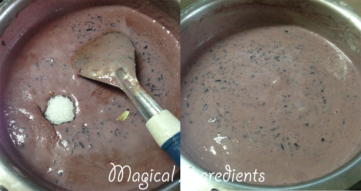 When all the milk is reduced, add sugar, crushed cardamom. cook till sugar dissolves.
