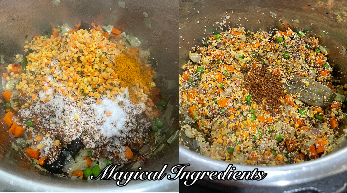 Next add the washed millets and dal, followed by salt, turmeric, and Kohlapuri Masala. Mix, and add water. Switch off the saute mode.