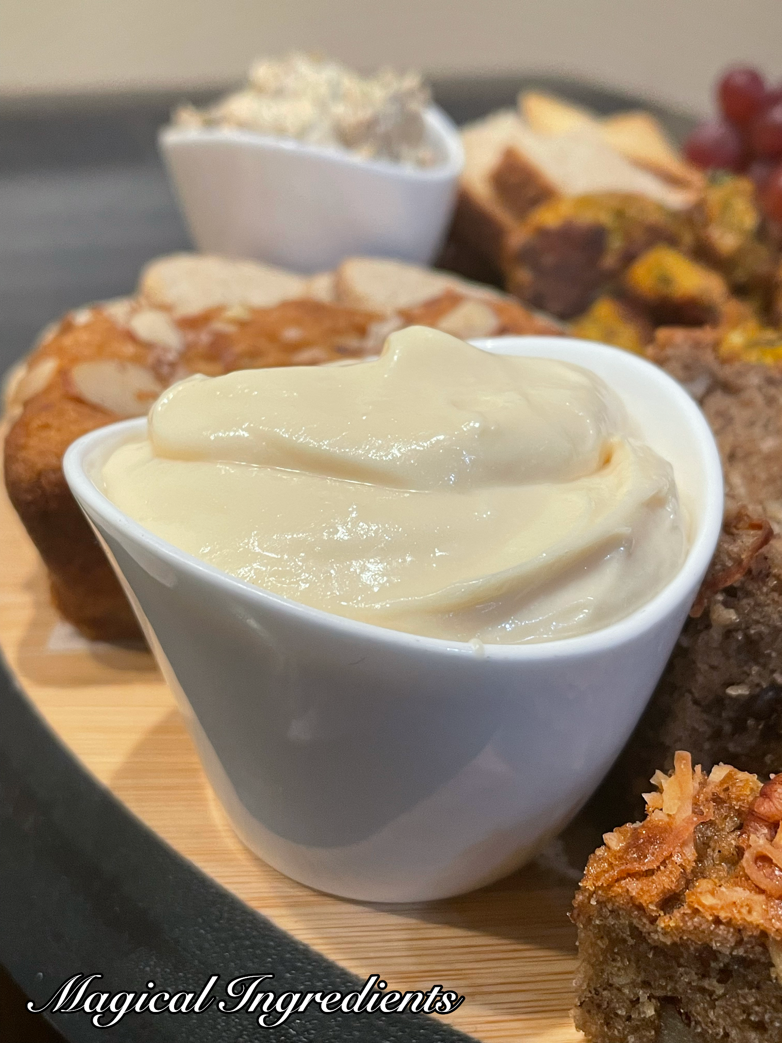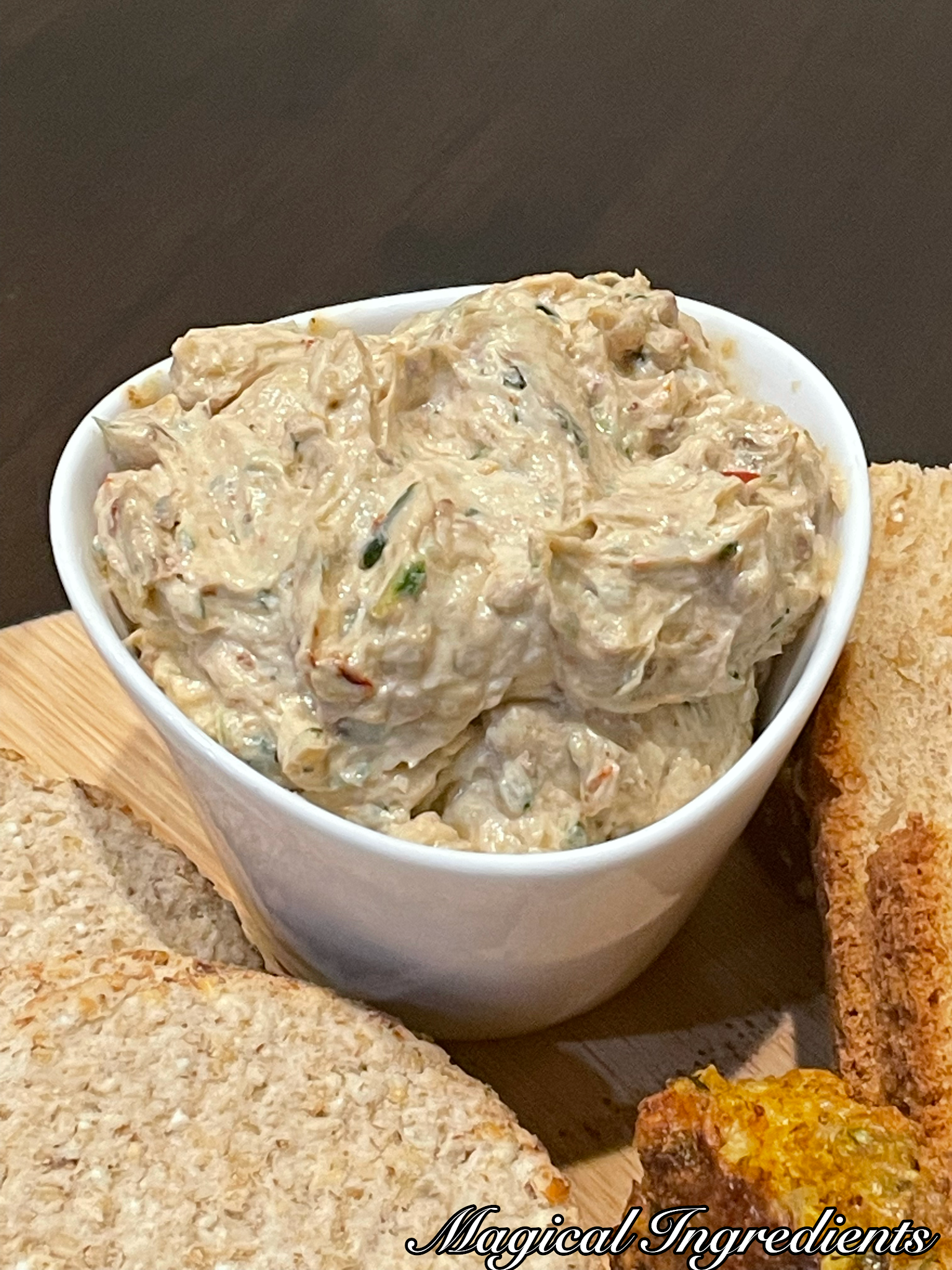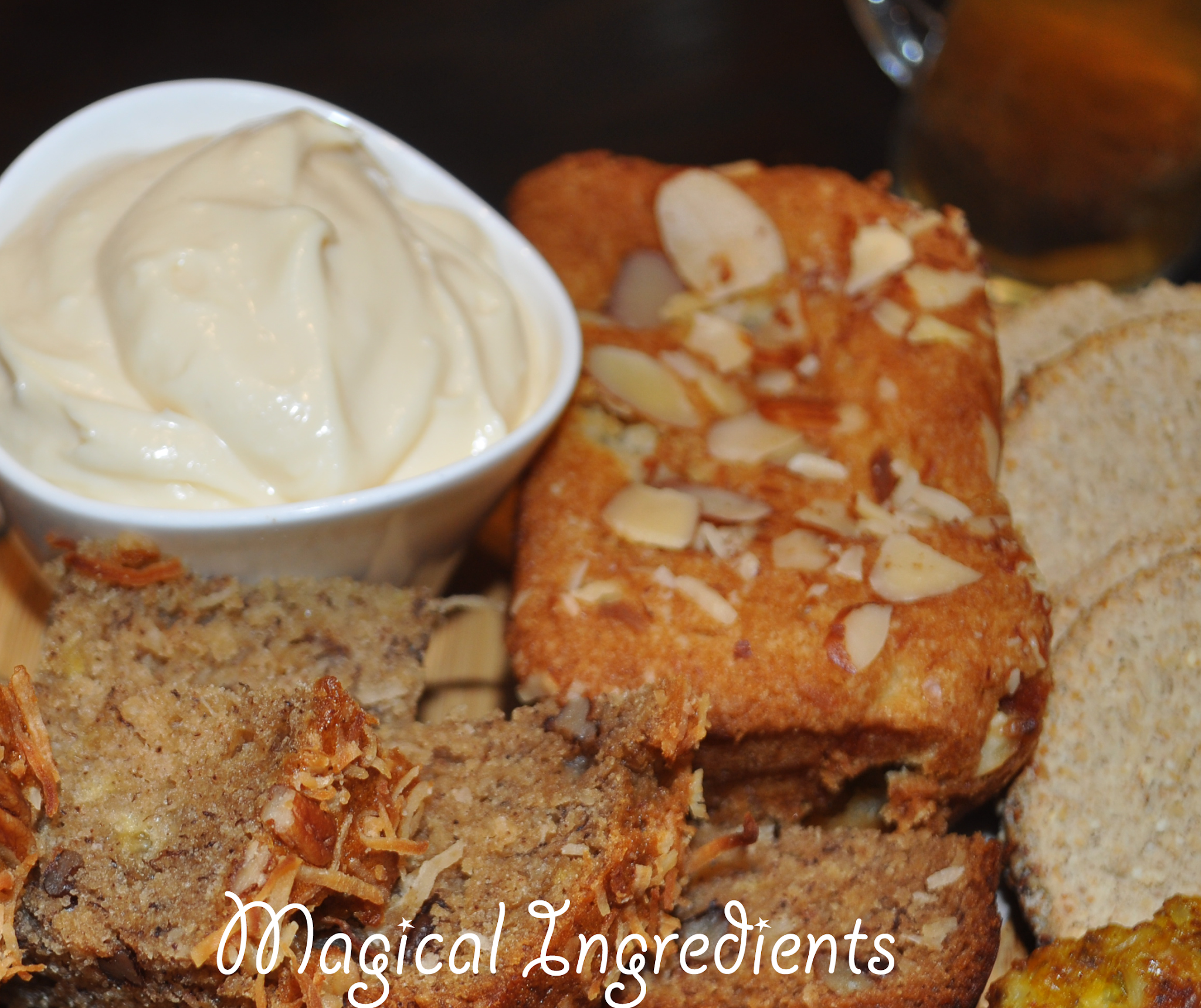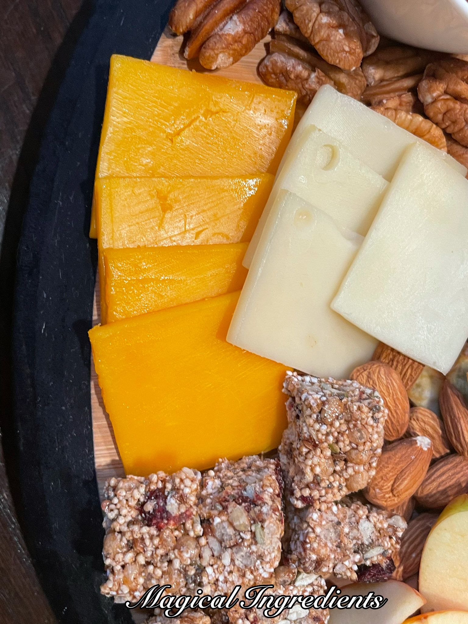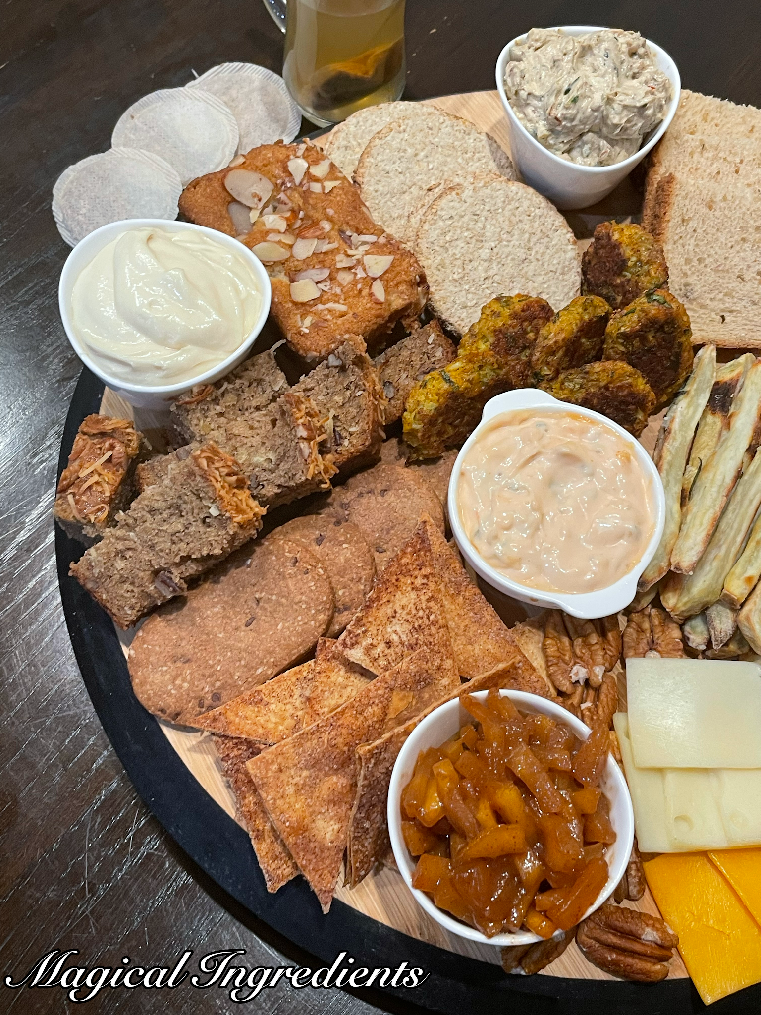 Along with the above, cinnamon tortilla chips, bread, pita chips, Cheddar Cheese, Jack Cheese, Spicy Ranch Dressing, Cheesy Cauliflower Bites (These cauliflower bites are gluten-free and low in carbs), Caramel Sauce, Vegan Coconut Maple Banana Loaf and almonds were also used in the charcuterie board.