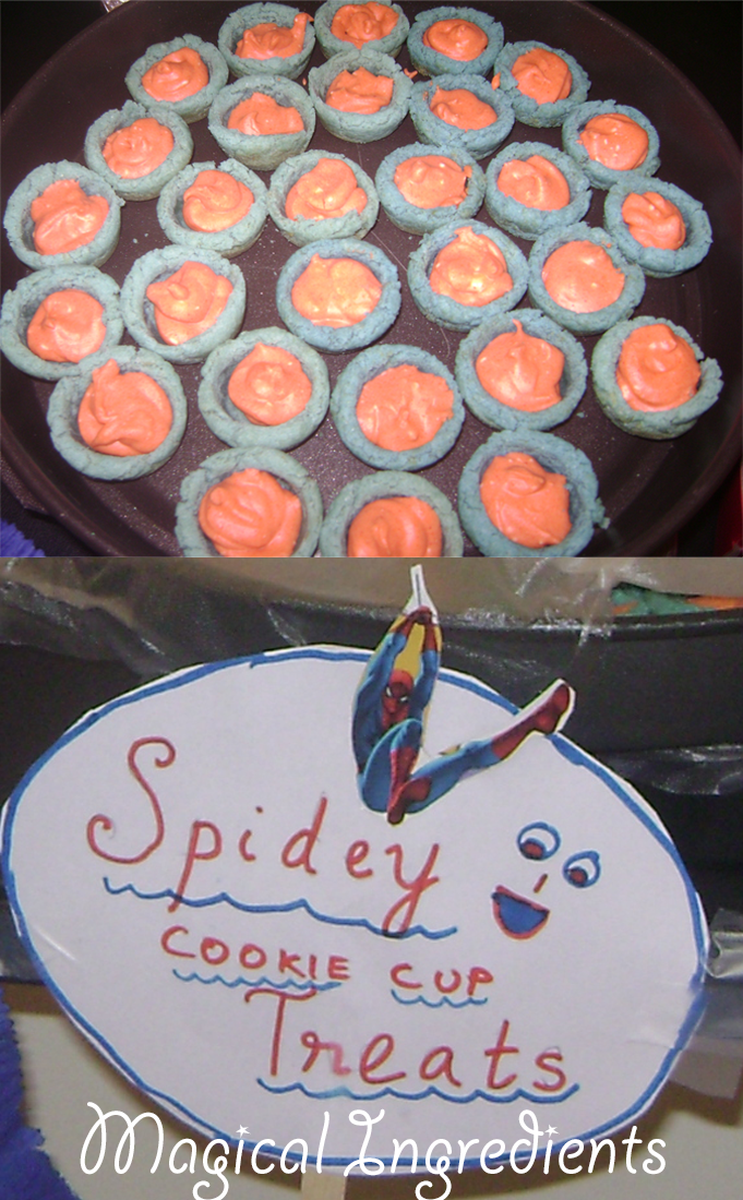 Cookie cups in Spiderman colors and Jello added fun to the party. These sweet treats were gone in a flash. The cookie cups were made with colored sugar cookie and red colored white chocolate filling! Adults too loved these cookie cups!