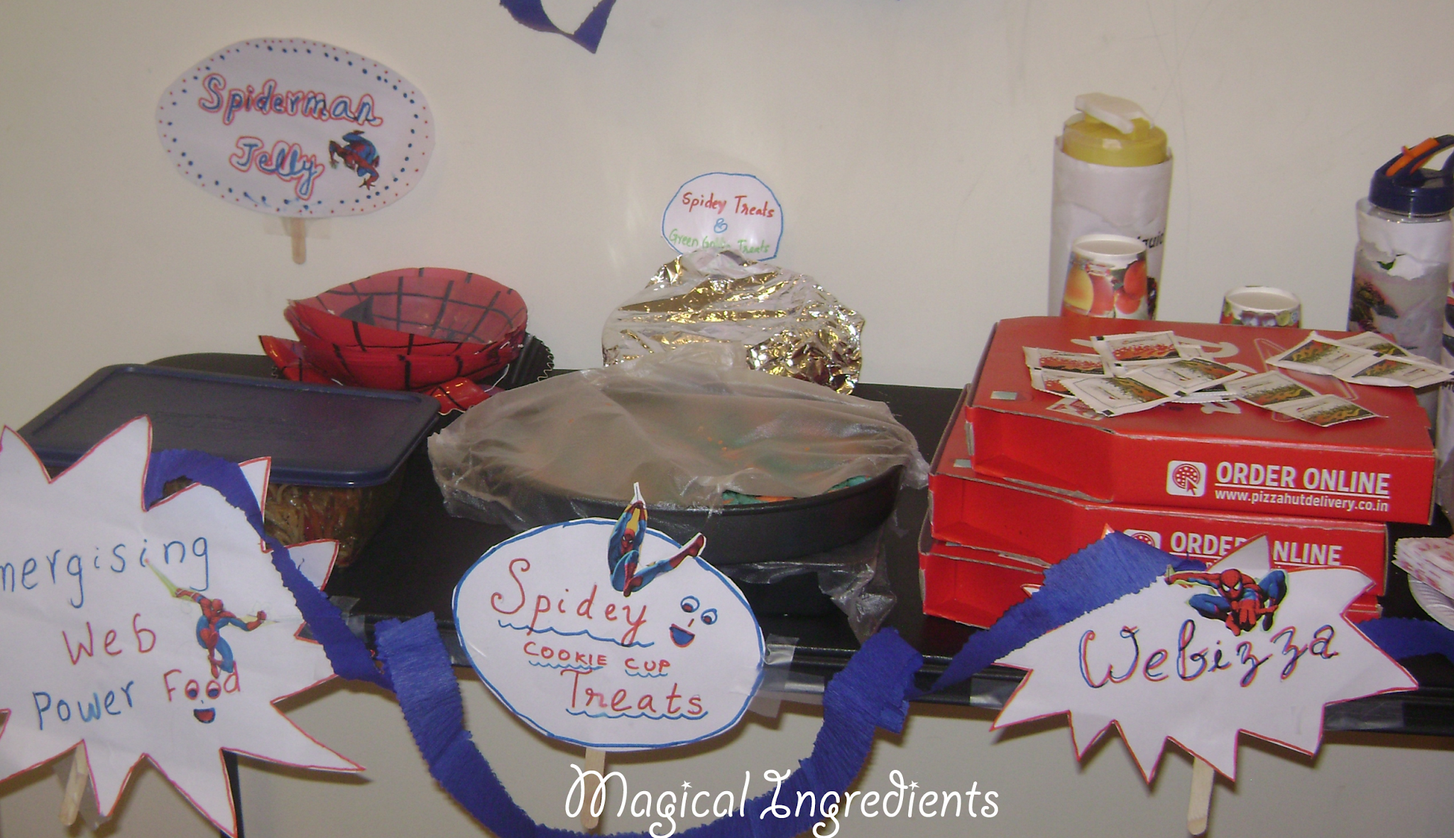 We also made fun food labels. Again , it is just using papers and markers and writing them in the theme colors. We made the label sound fun with the food that we planned and it was a huge hit. With every label, kids were super excited. It is that age that they think even the name will give them extra power to shoot spider webs. You can hear the web from their wrist out:-) That much fun!