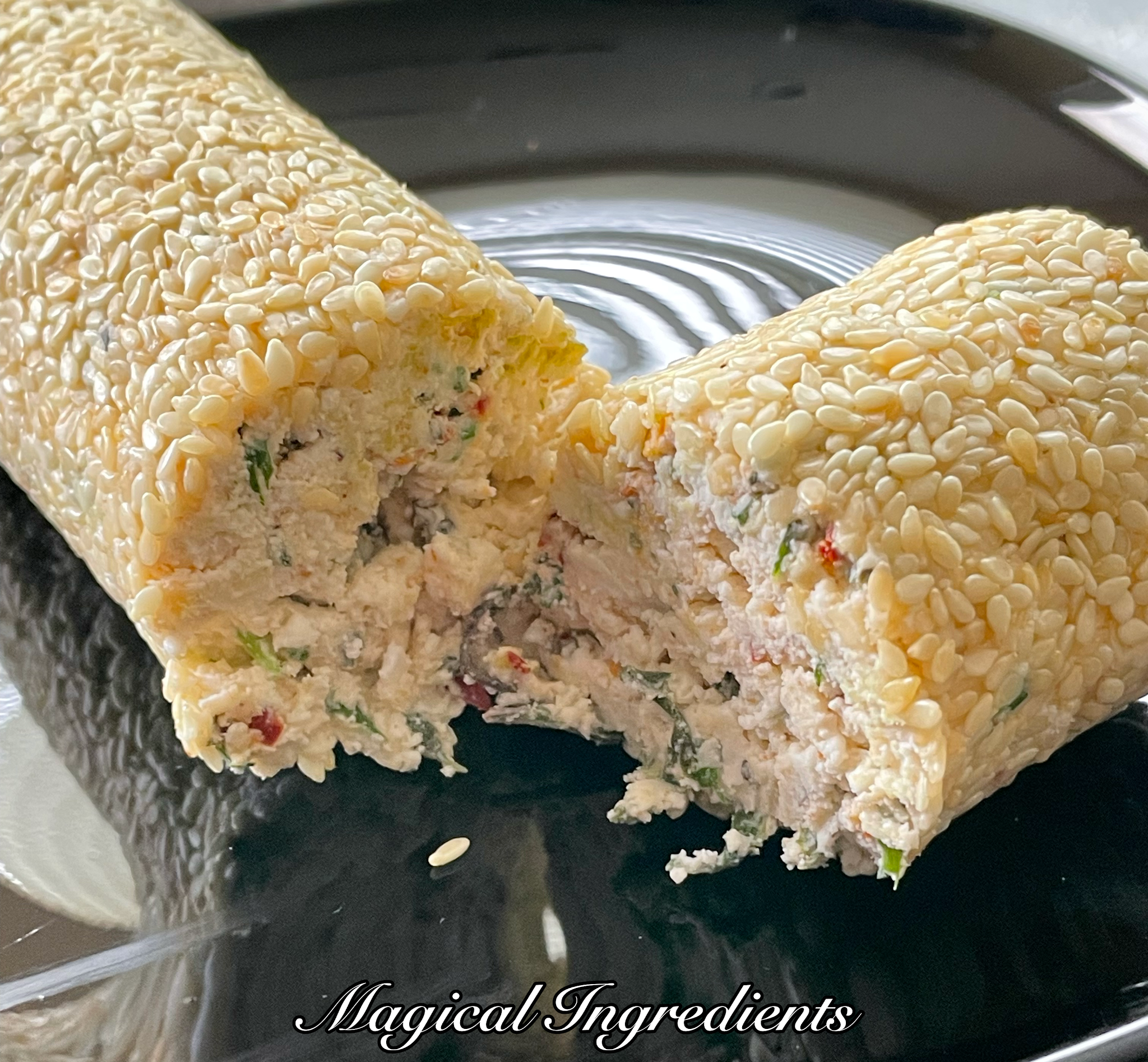 Gather the cheese mixture into a ball or log. Place the sesame seeds in a plate and roll the cheese ball/log to coat a layer of the seeds.