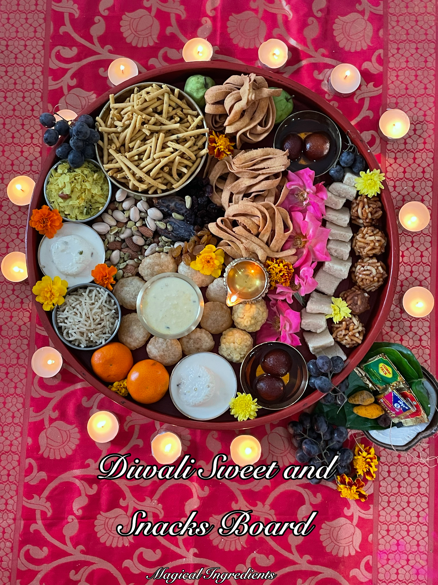 Back home, mom makes so many varieties and thinking about that here is a board I made - Diwali snack board with lots of yummy treats. I love the traditional Whole Wheat Halwa, Okkorai, and Ma Ladoo too! Whole wheat halwa and okkorai are my favorites and learned them from my mom (most of my learning). These amazing traditional recipes bring in the celebration settings in the air to have maximum fun.