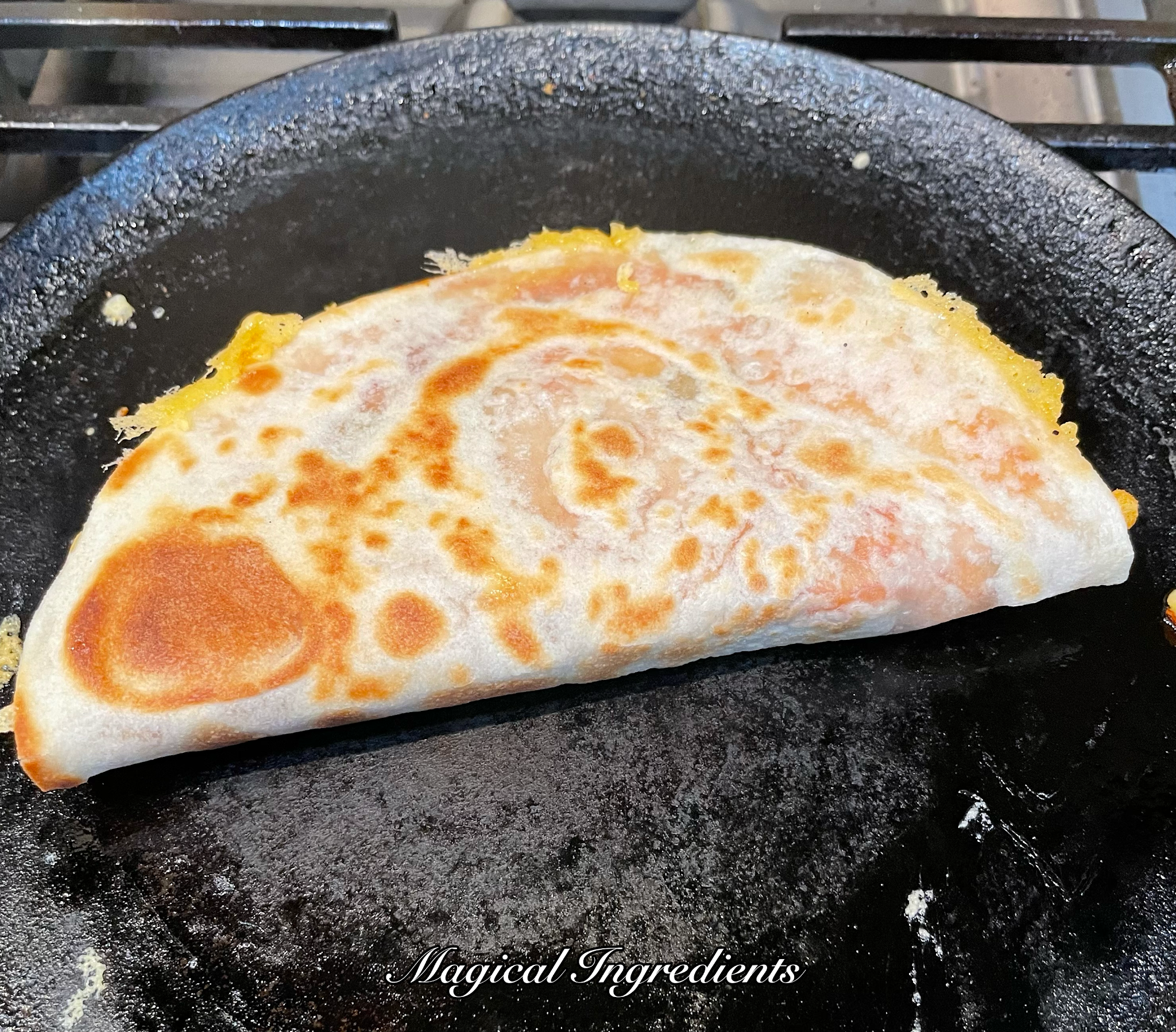 Fold in half and cook flipping the sides till the cheese is melted and the tortilla is cooked.