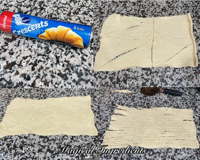 Remove the crescent rolls out of the packaging. Attach the perforations and roll slightly to make it as one sheet. Cut into 20 strips.