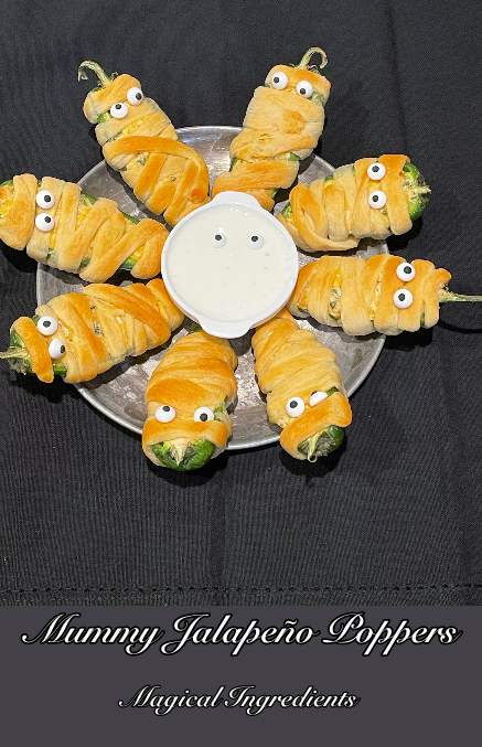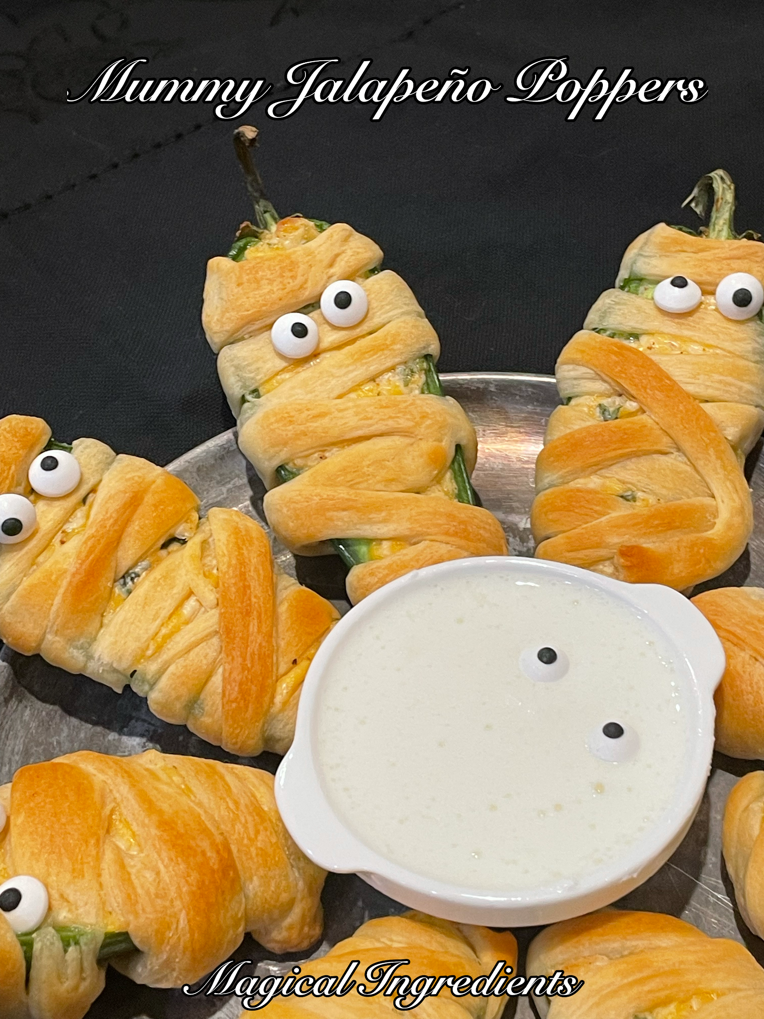 Preheat the oven to 350 degrees. Roll each jalapeno piece with a dough strip to look like a mummy. Arrange on a baking sheet.
