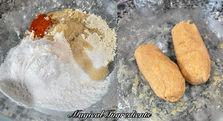 Add all the dry ingredients to a bowl. Slowly heat oil simultaneously. Add two tablespoons of hot oil to the flour mixture (sizzling sound can be heard when added). Sprinkle water slowly and knead to a soft dough.Shape them as per the extruder size.