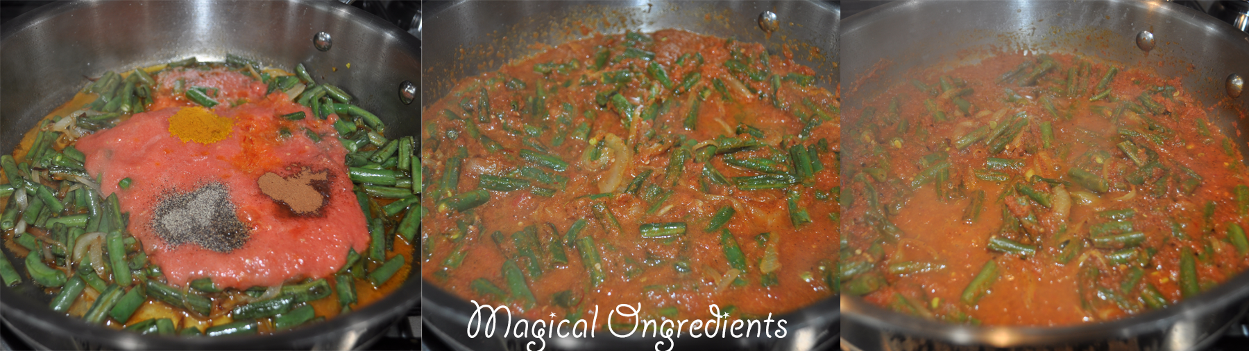 Puree the tomatoes and set aside.Heat three tablespoon oil in a heavy bottomed pan. Add the onions and saute for 4-5 minutes till translucent. Add the beans, 1/2 tsp salt, and stir-fry for about 8 to 10 minutes.Keep an eye not to burn the beans.