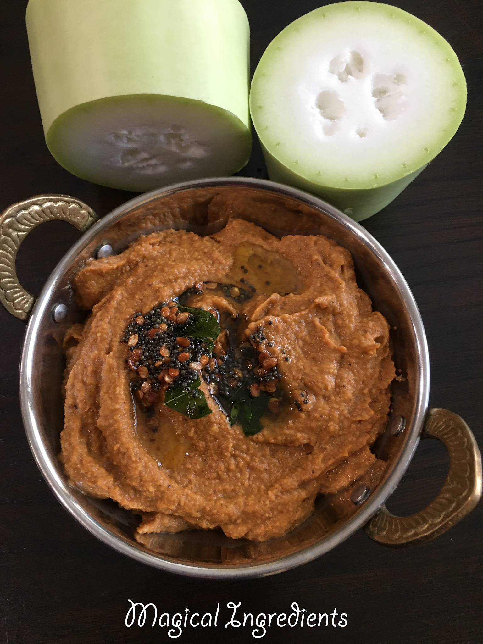 Dal and chiles are roasted, the shredded bottle gourd is cooked a little. Then it is ground with salt and turmeric. Finally do the tempering with a little mustard seeds and split urad dhal. This can be made in under 30 minutes. It is important to cook down the bottle gourd a little so that some of the water content is reduced. Bottle gourds are water rich veggie and hence need to do this step. Also, there is no need to add water while grinding as the bottle gourd will have the wetness to make a smooth chutney.
