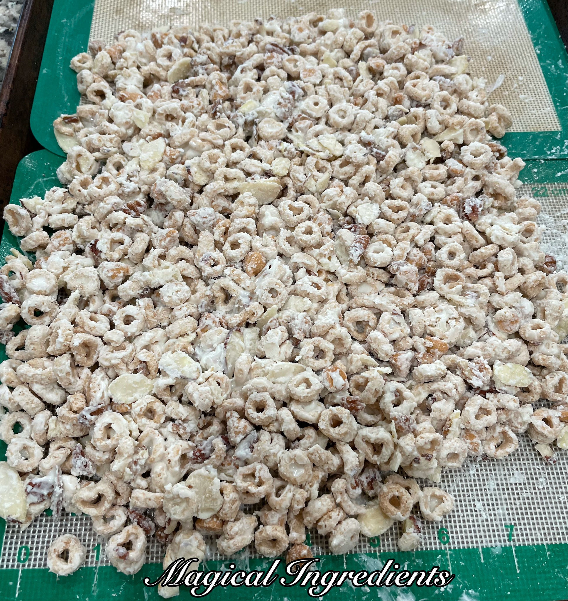 I prefer to add the pretzels separately. They can be added initially with the cereal too. It is just my preference to have the pretzels look distinct while the others look frosted. Also, keeping them like coated is our preference. Double the chocolate chips to make them into clusters and break apart into pieces or chunks. White chocolate morsels or milk chocolate morsels can be used. I just prefer to keep it look like frosted pieces.