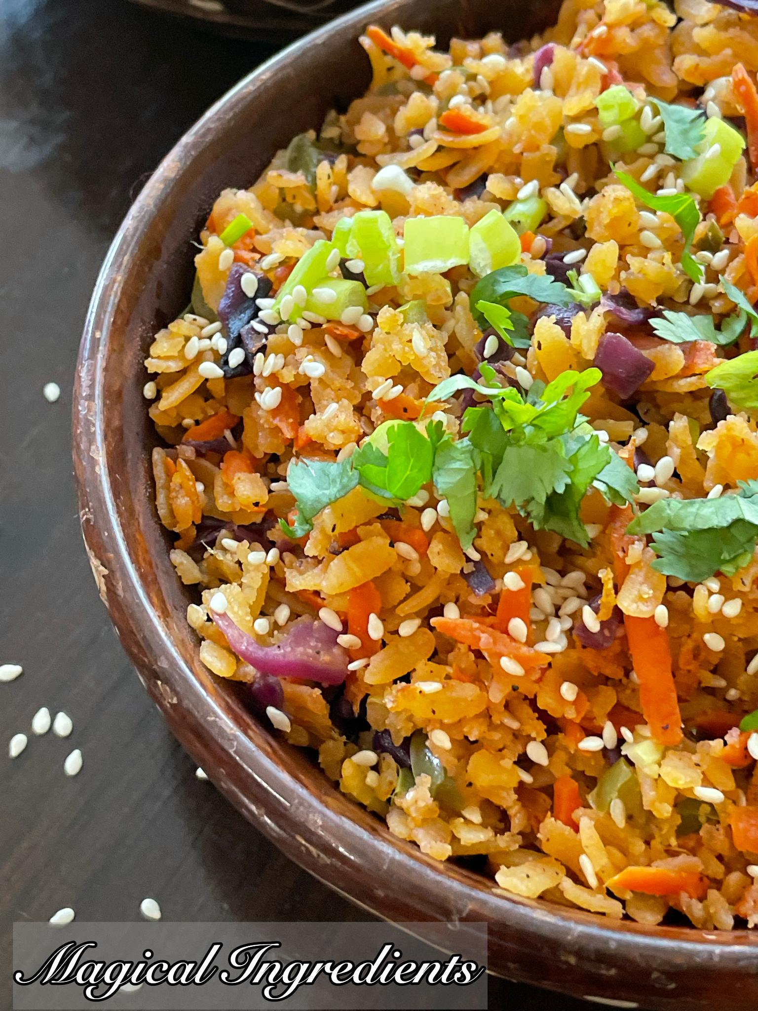 Fried rice is always a favorite one. Not only in our home, I guess. Though fried rice can be made with leftover rice too, we don't make too much extra to make a meal. Cooking the rice to the perfect texture and making it may not sound great after a long day.Wait! there is an alternative to that. POHA! Yes, Poha works great and it soaks in five minutes. This is a game changer. Soak the poha with a little water when you chop the veggies, and this helps in saving time to bring the dinner to the table in 30 minutes. Isn't it amazing?