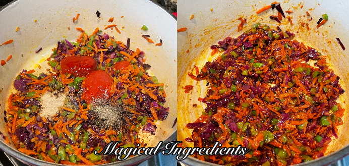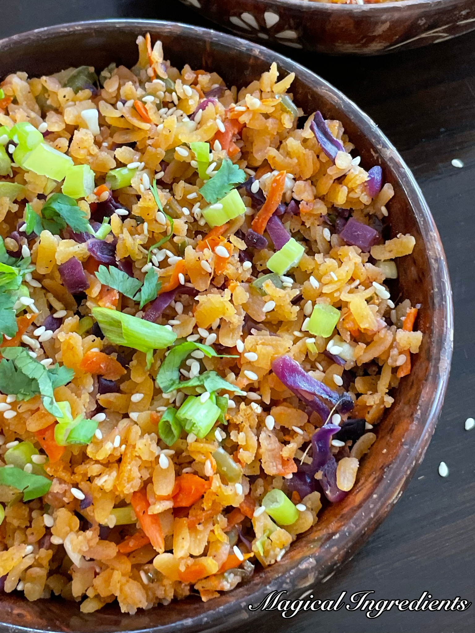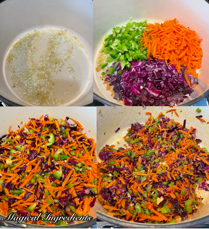 It is a great idea to shred the carrots which help in cooking faster. Purple or green cabbage can be used, or a mixture of both will also work. Red and/or green peppers, chopped fine works. Chopping these veggies and ginger and garlic may take a max of 12-15 minutes and this time, poha can be soaked, sesame seeds can be toasted. If you have pre-cut veggies, it reduces the prep time.