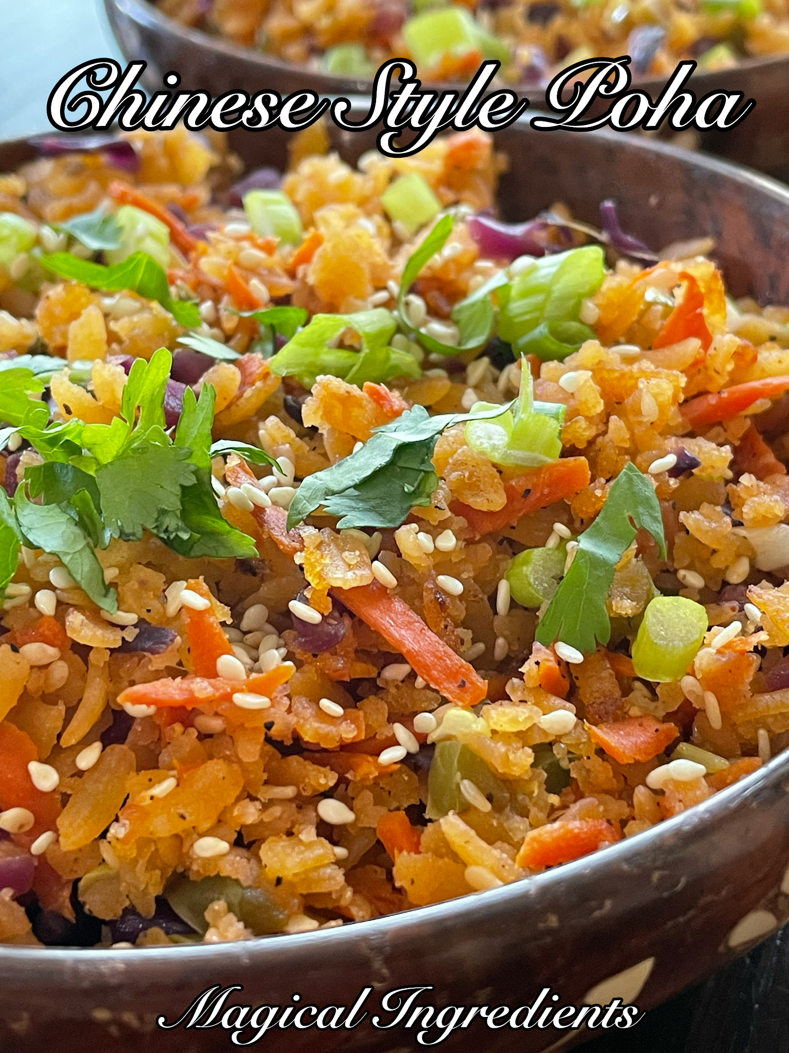 This poha is full of flavors - a Chinese fusion - that would be a comforting and satisfying meal for the entire family. This can be made in 30 minutes and is loaded with veggies - perfect for weeknights or weekends - easy and tasty! Poha makes this meal a lighter one.