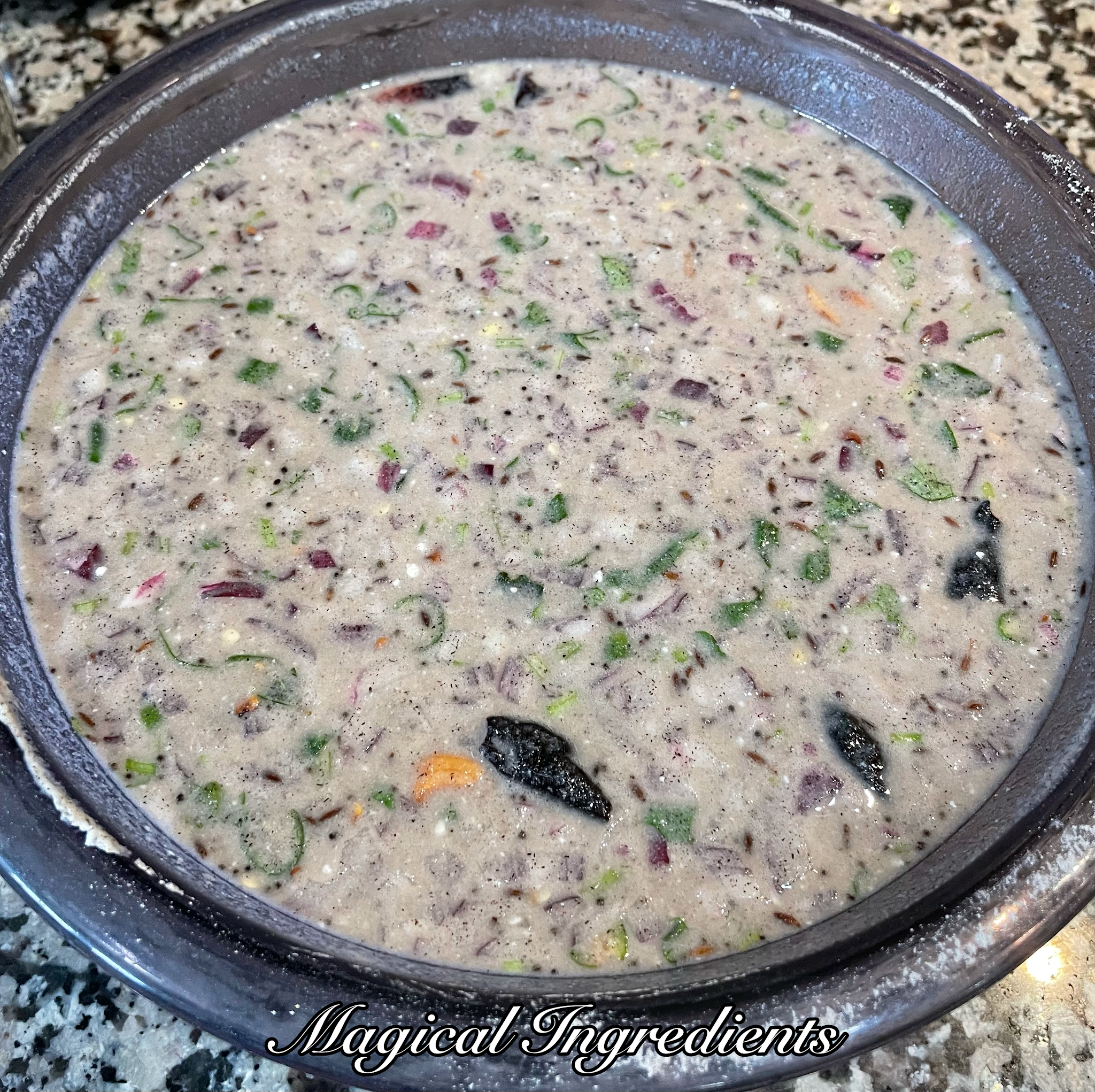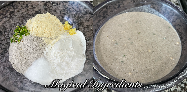 In a big bowl, add the buckwheat, soy, and rice flours followed by ginger, green chile, and salt. Whisk in to a smooth batter adding sour yogurt and half the water.