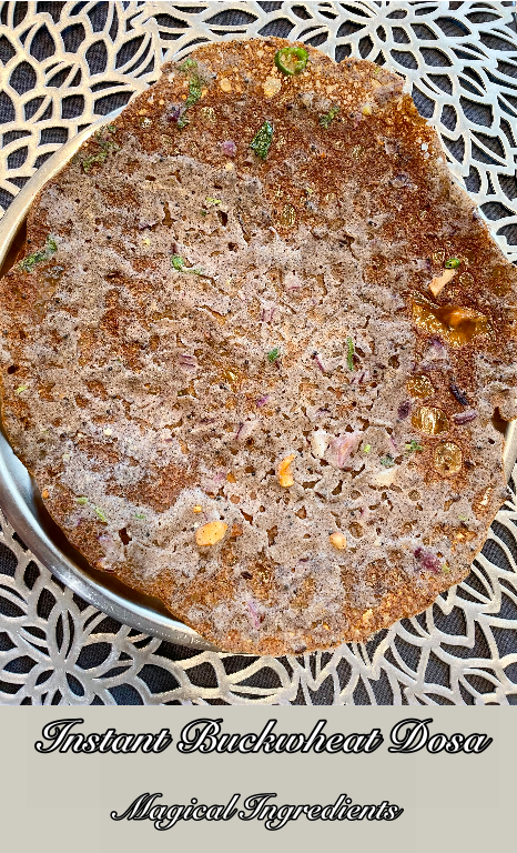 Buckwheat dosa can be made in a few minutes and need no soaking are grinding. This instant lacey dosa makes an amazing dinner even on busy weeknights. This pairs great with sambhar or any chutney.