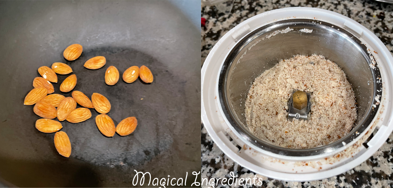 Dry roast the almonds, cook, and grind to a coarse powder.