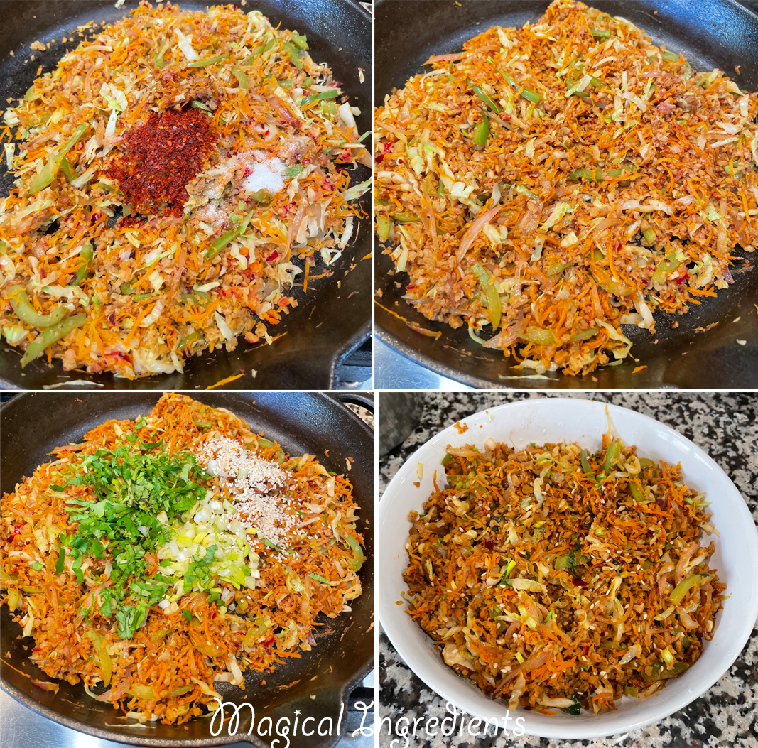 Add salt, gochugaru, and soy sauce, stir-fry for a minute. Switch off the flame, add the green onions, cilantro, sesame seeds, mix thorougly. Transfer to a bowl and set aside to cool.