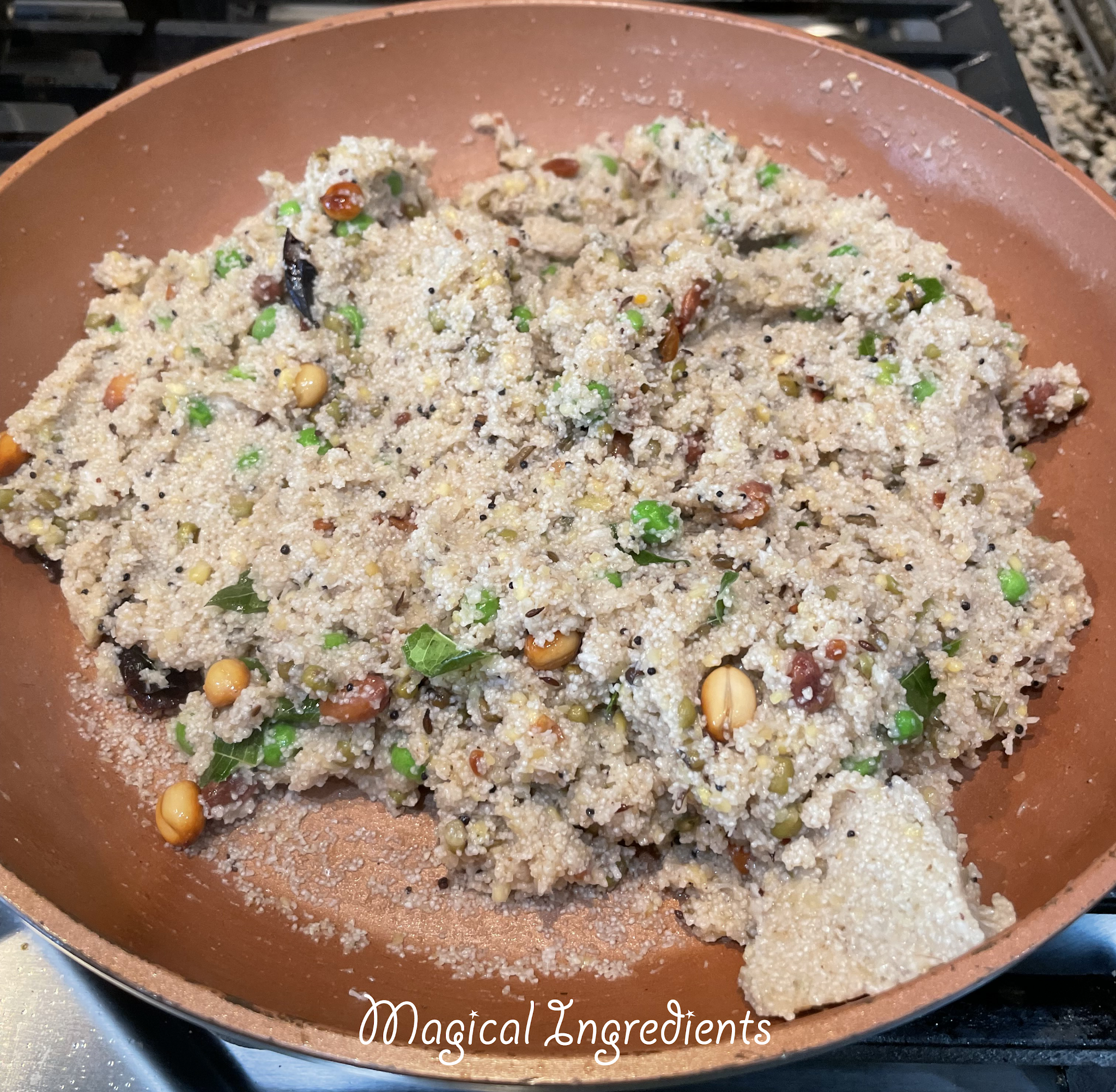 Add water and bring it to a boil. Add the cooked moong, peas, coconut, ground coarse dal, salt, and mix without any lumps quickly. When it begins to boil, add the millet rava/semolina and mix thoroughly to avaoid any lumps.