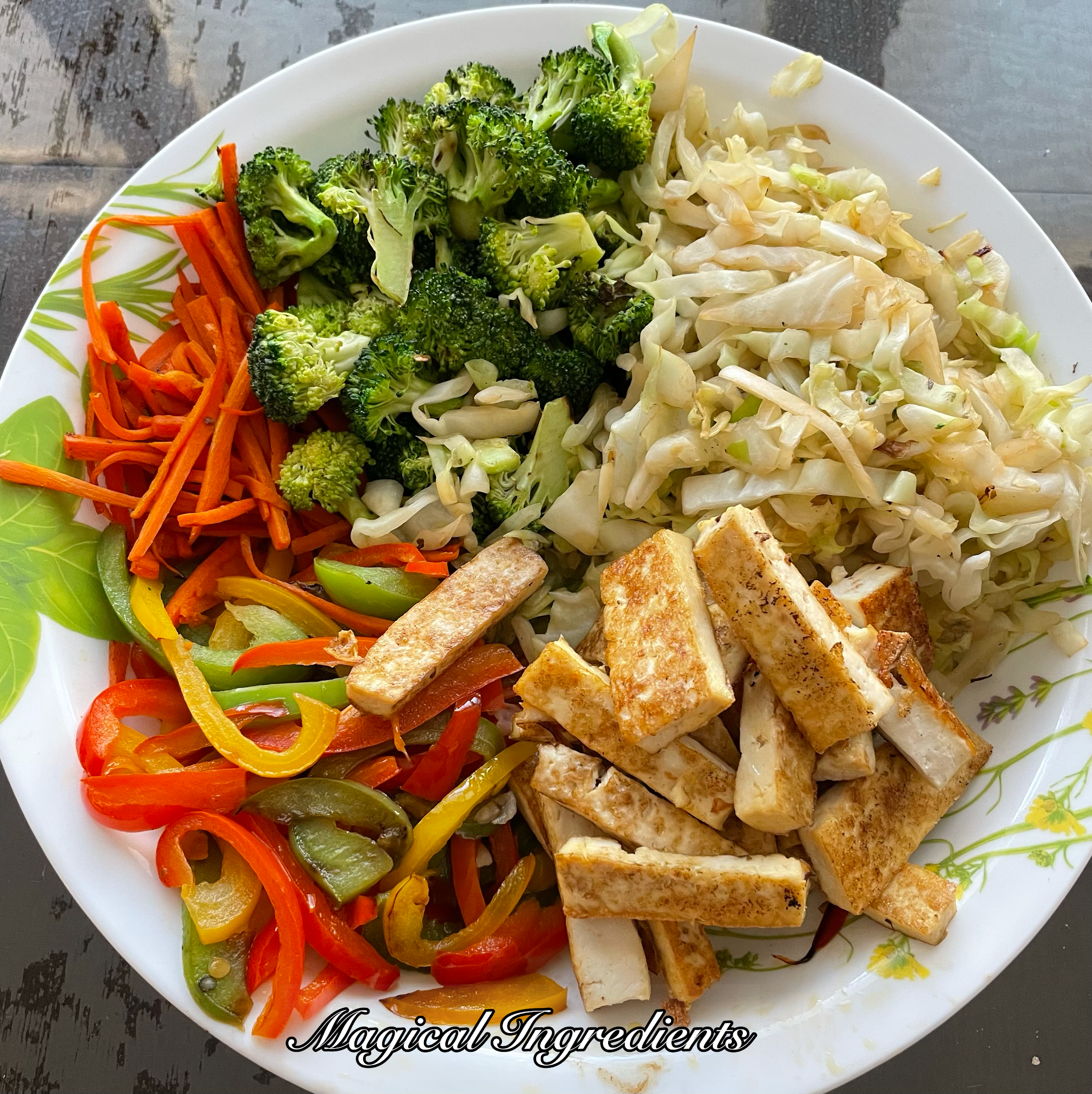 When using tofu, make sure to press and remove the water completely out of tofu. This makes them hold shape.After all the water is removed, slice them into long strips or chunks and then pan fry them till a litle crisp for best texture in noodles. I love lots of veggies loaded on to my bowl, so added colorful veggies that I had in hand. Mushrooms are great addition too, add a little or swap for any veggies. I prefer to cook the veggies separate just crisp tender. So cooked them separately. If you are in a hurry, just dump everything and stirfry, just add cabbage finally as it cooks faster. When you have all the veggies ready or use store-bought pre-packed chopped veggies, it could save time in fixing dinner very quickly, in fact an amazing one!