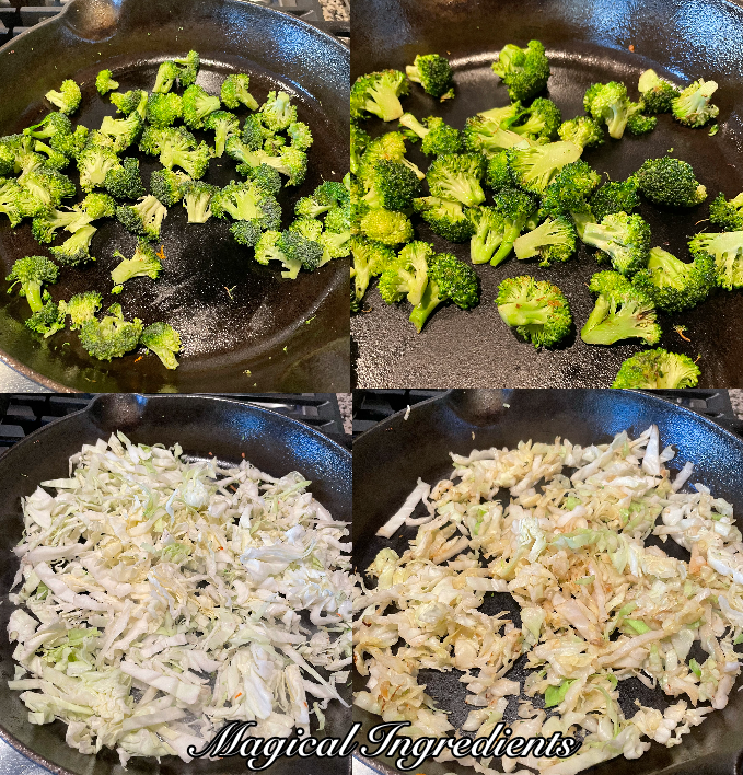 Add another half tablespoon oil and saute the broccoli for 2 minutes, set aside. To the same pan, add the cabbage and saute for 1-2 minutes. Set it aside.