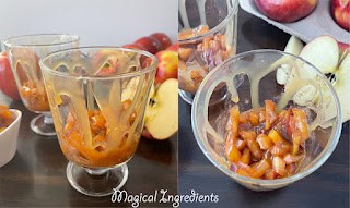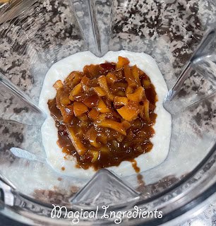 Once cool, blend the fresh chilled yogurt with caramel apple pie filling (reserve 3-4 tbsp, optional) to a smooth consistency.