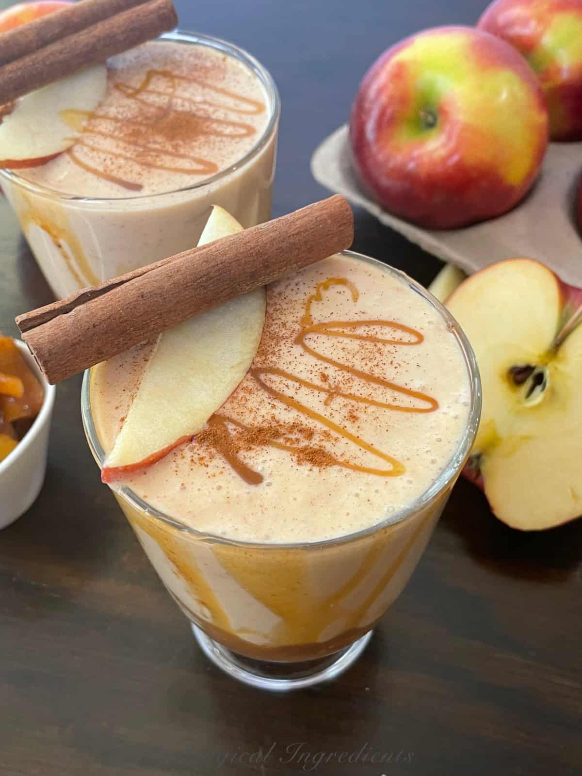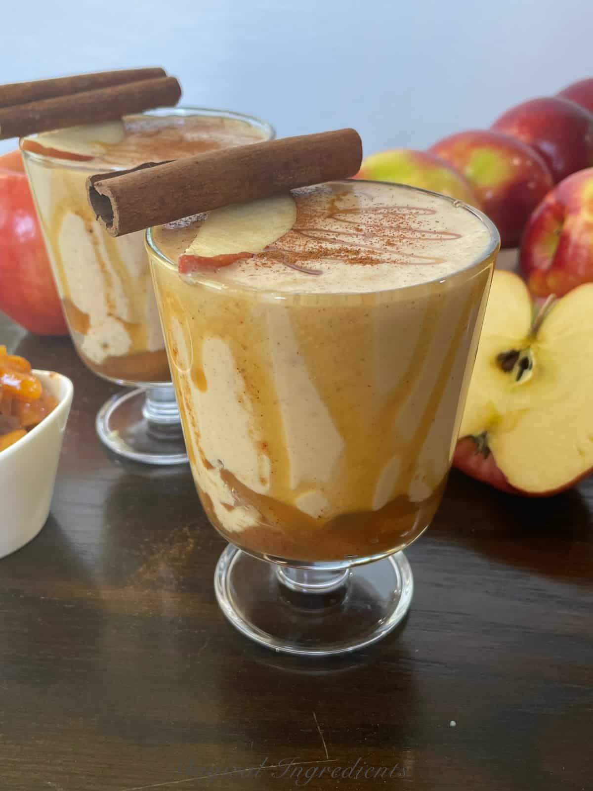 Optional: Add the reserved caramel apple pie filling to serving glasses. Drizzle the sides with extra caramel.