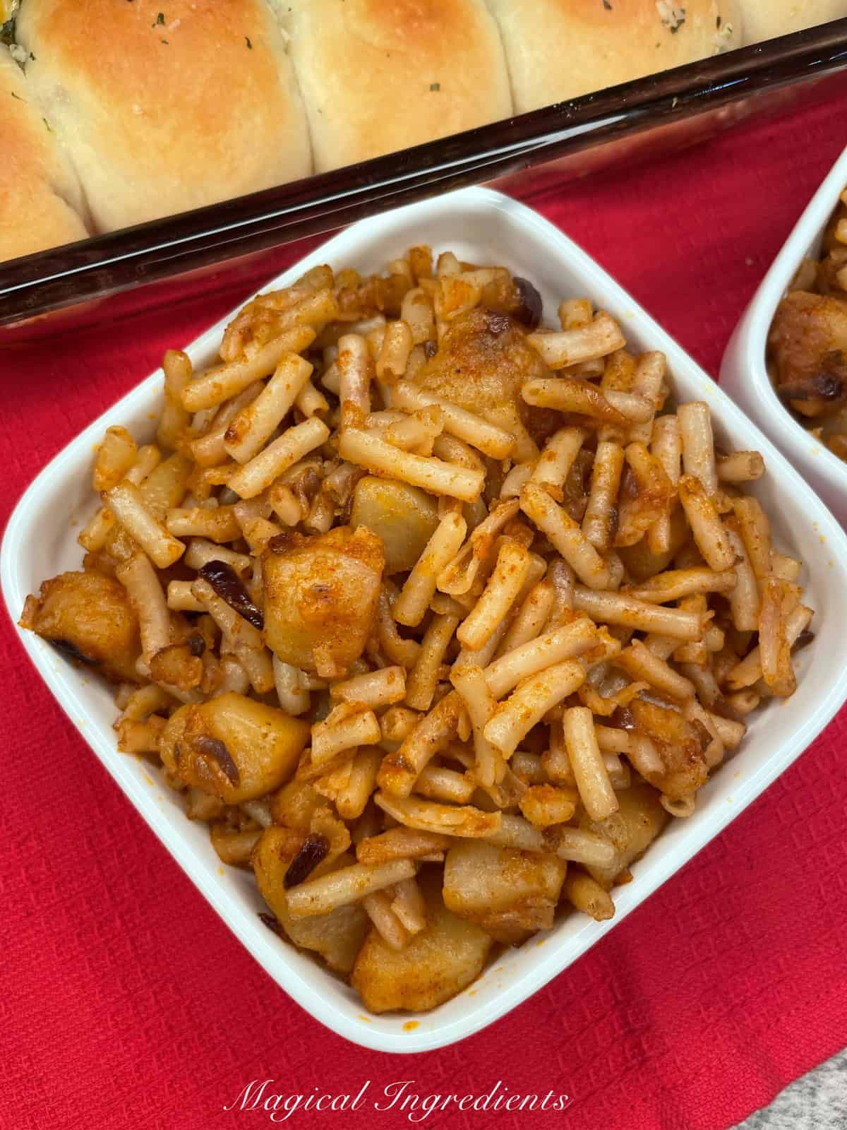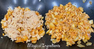 In the meantime, cook pasta according to package directions and set aside.Heat oil in a pan over medium flame. Add the onions and sauté for 3-4 minutes until they turn translucent. Add the chopped potatoes, salt and cayenne, cook for another 3 minutes.